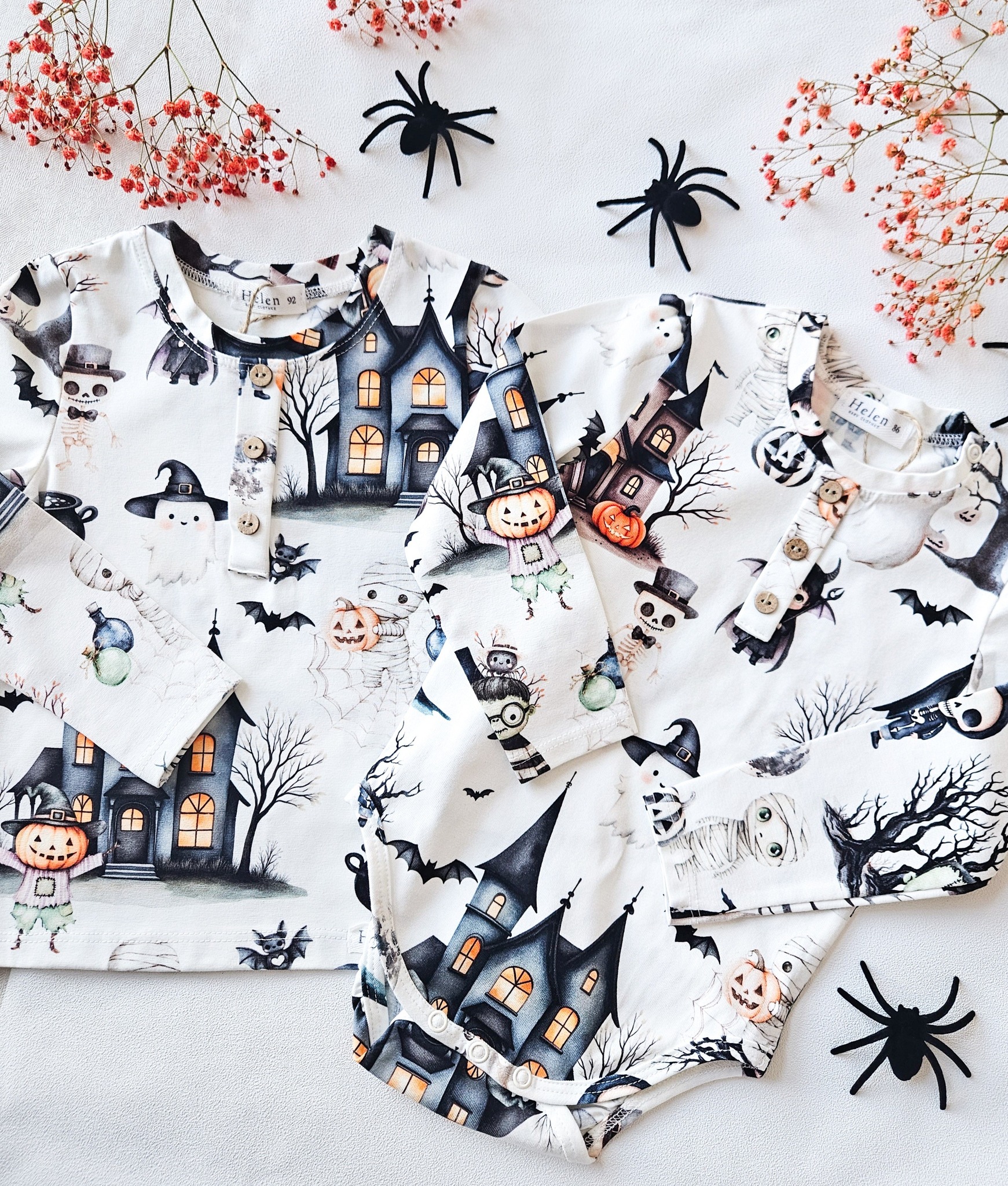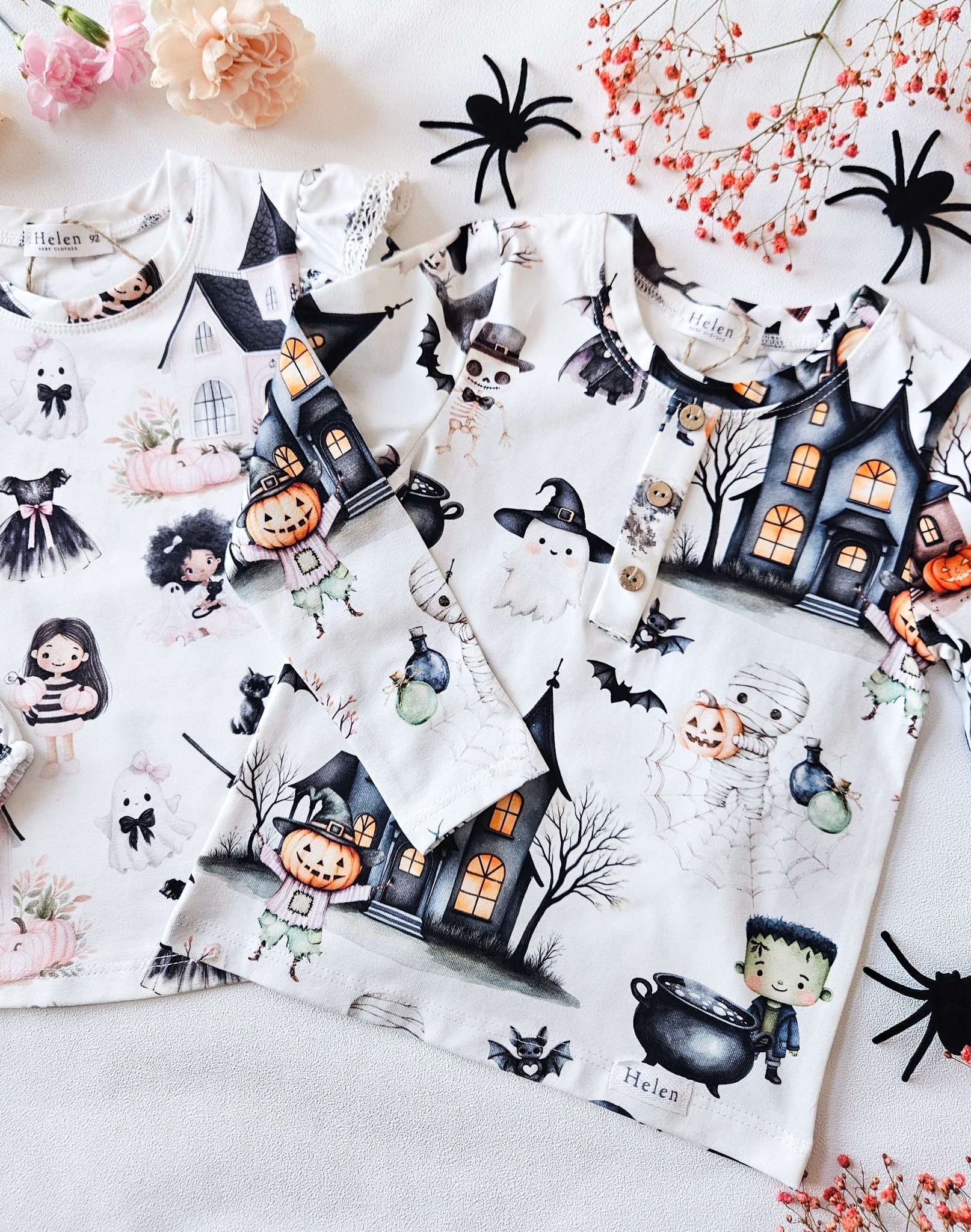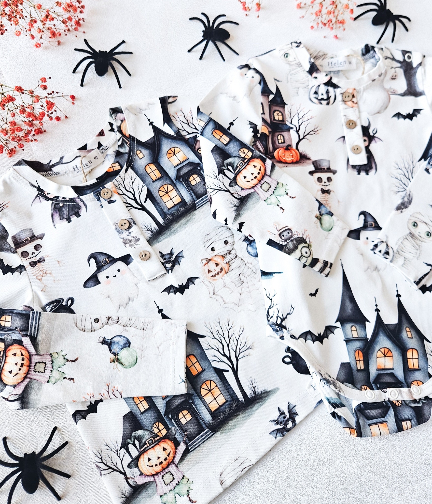Lõbus ja omanäoline poiste body, millel on vahvad Halloweeni tegelased – kõrvitsad, kummitused, luukered ja nõiamajad. Disain ühendab mängulisuse ja pehmuse, pakkudes lapsele mugavust kogu päeva vältel. Esikinnisus puidunuppudega lisab stiilset aktsenti ning muudab riietamise lihtsaks.