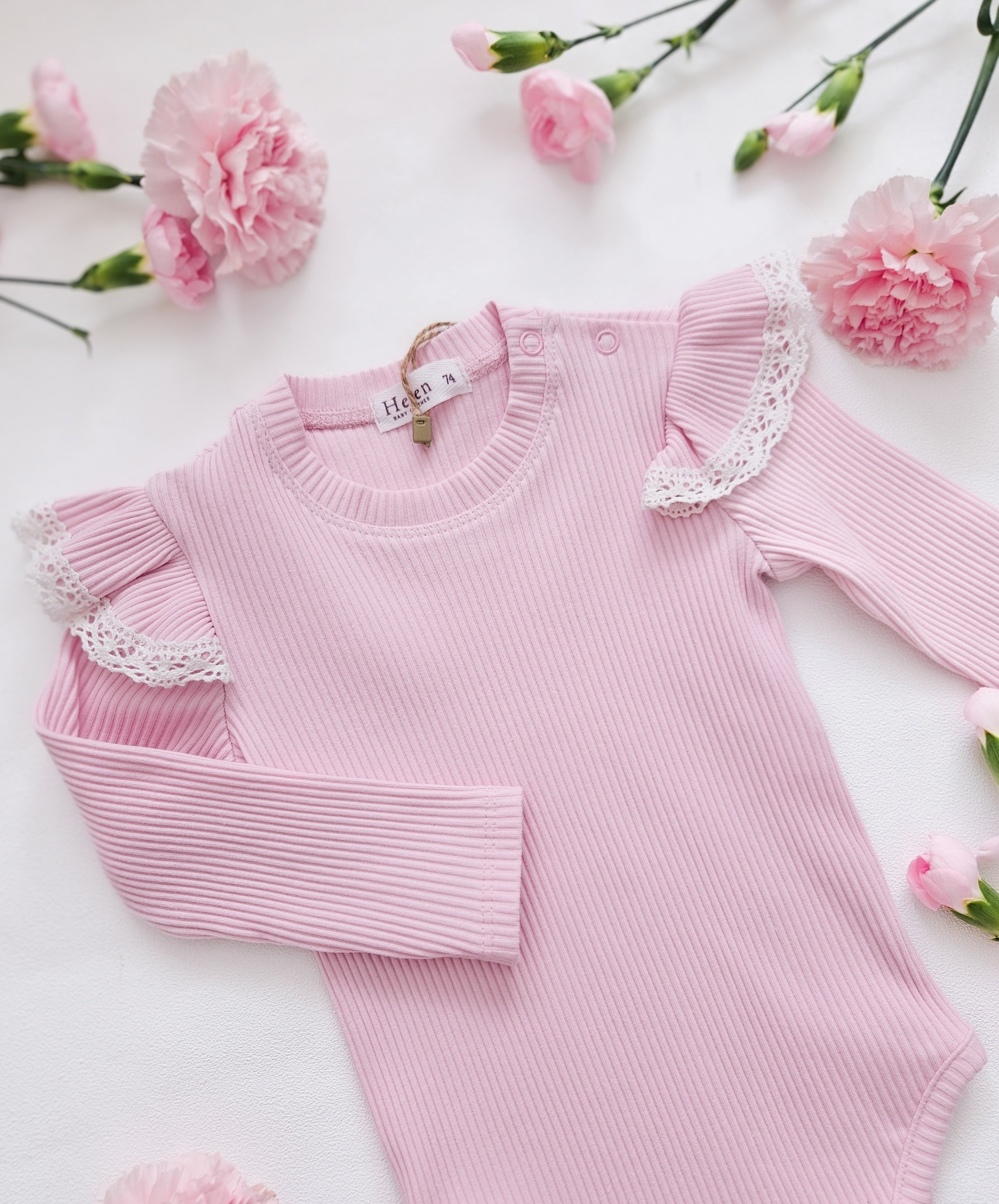 Kaunis ja mugav tüdrukute body, mis on valmistatud kvaliteetsest soonikkangast. Õrnroosa toon lisab rõõmsat ja tüdrukulikku sära, samas kui pitsilised satsid õlgadel annavad romantilise ja peene aktsendi. Sobib suurepäraselt nii igapäevaseks kandmiseks kui ka erilisteks sündmusteks.