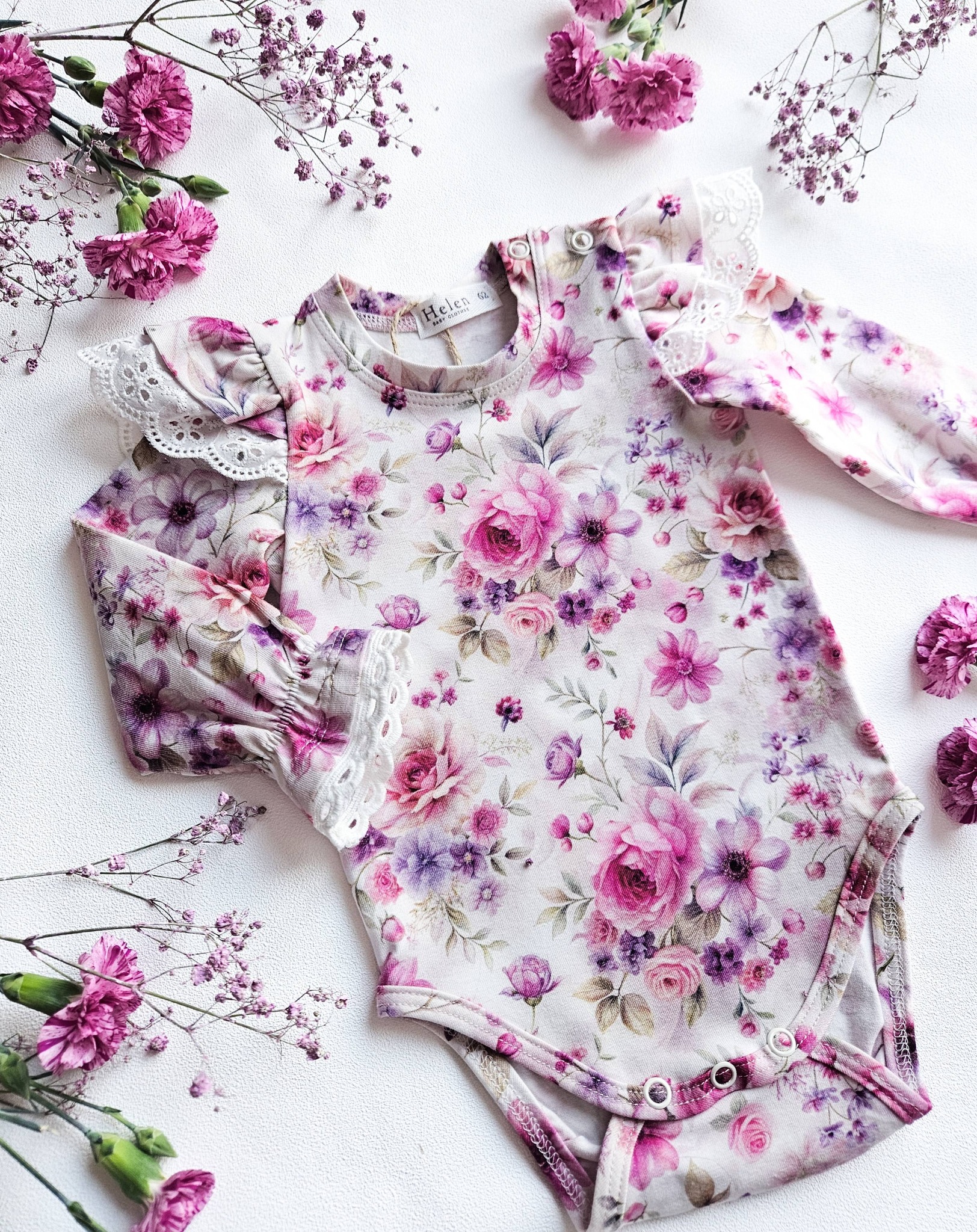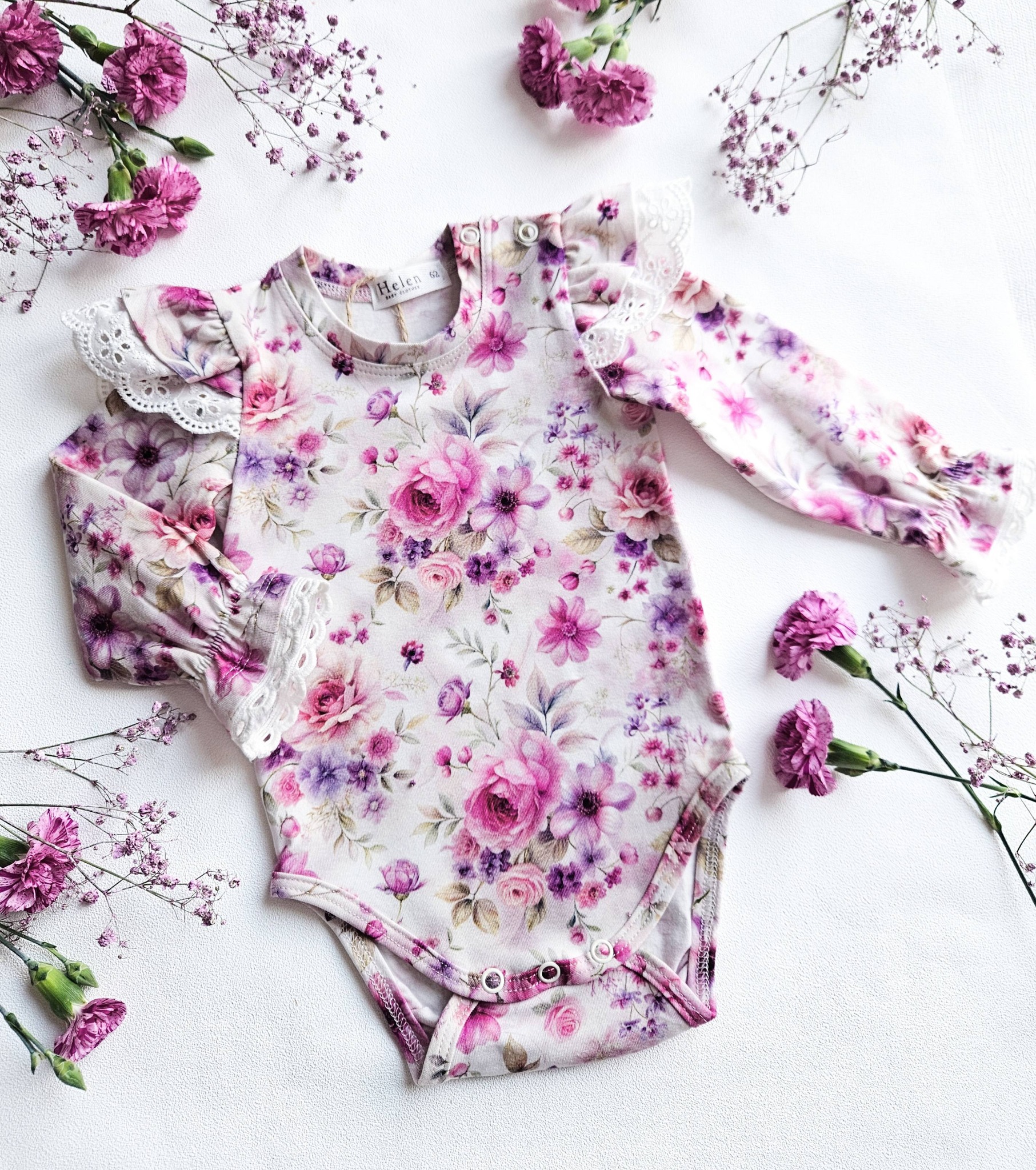 Õrn ja romantiline tüdrukute body kauni värvilise lillemustriga. Heledal taustal roosad ja lillad lillekimbud loovad värske ja tüdrukuliku ilme. Bodyt kaunistavad pitsilise äärega volangvarrukad, mis lisavad pidulikkust ja armsat detaili.