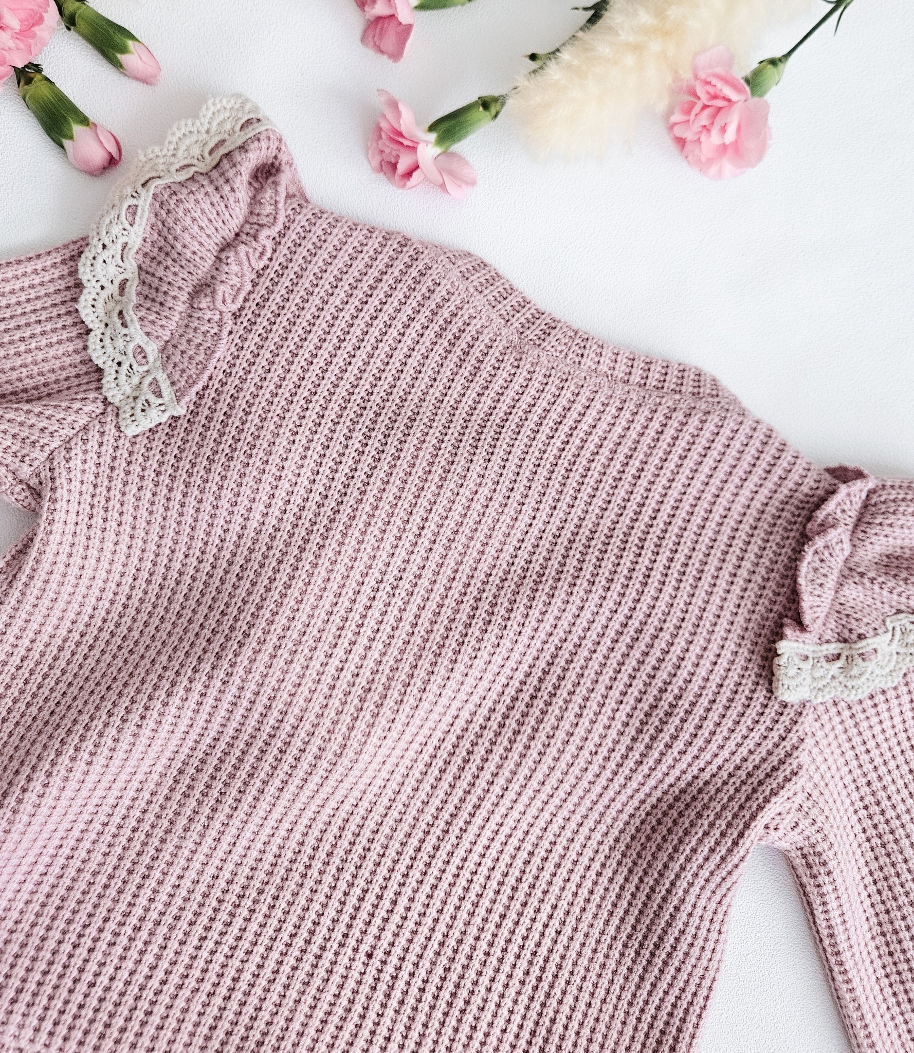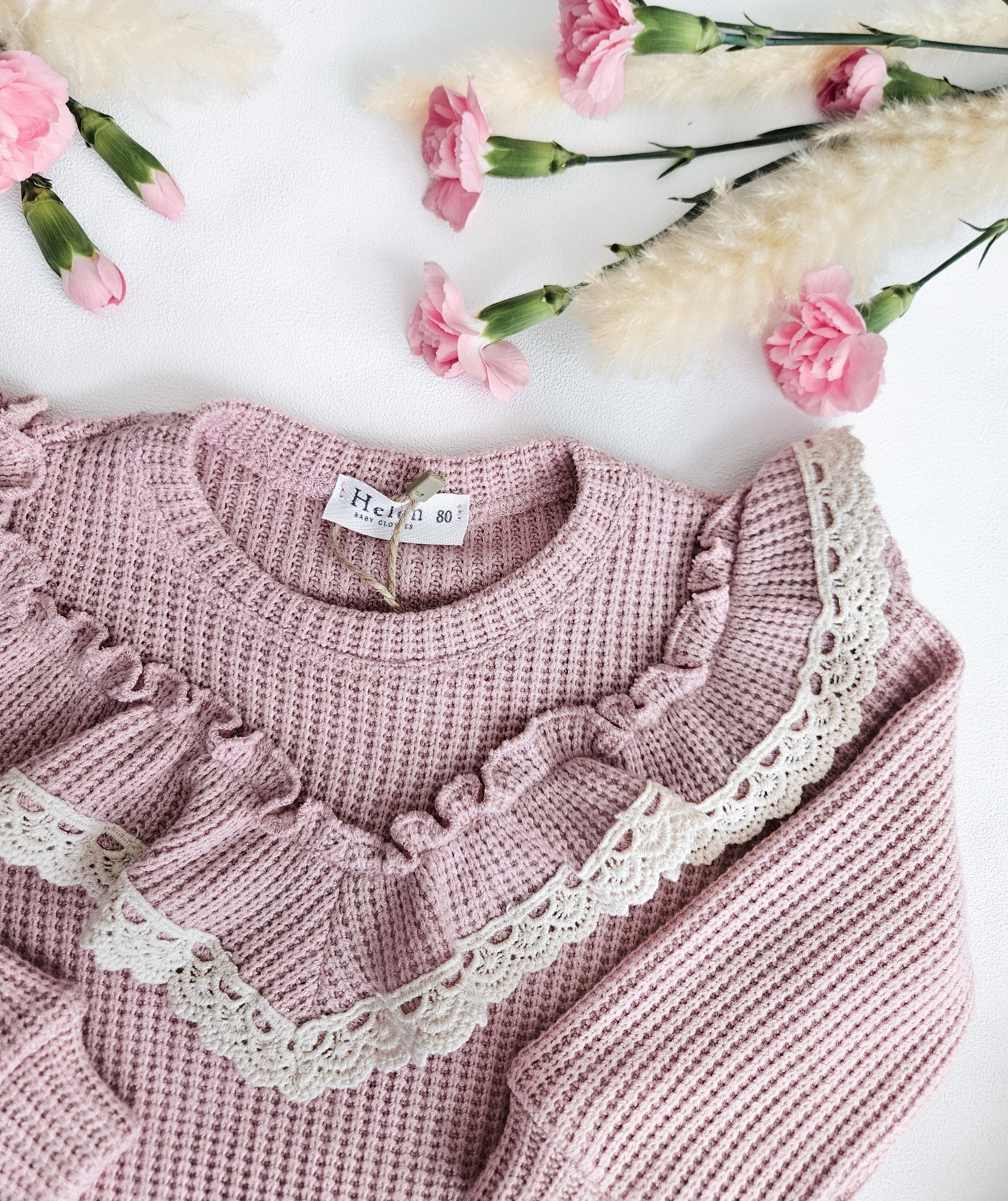 Tüdrukute kampsun – puudriroosa pitsiliste satsidega 🌸