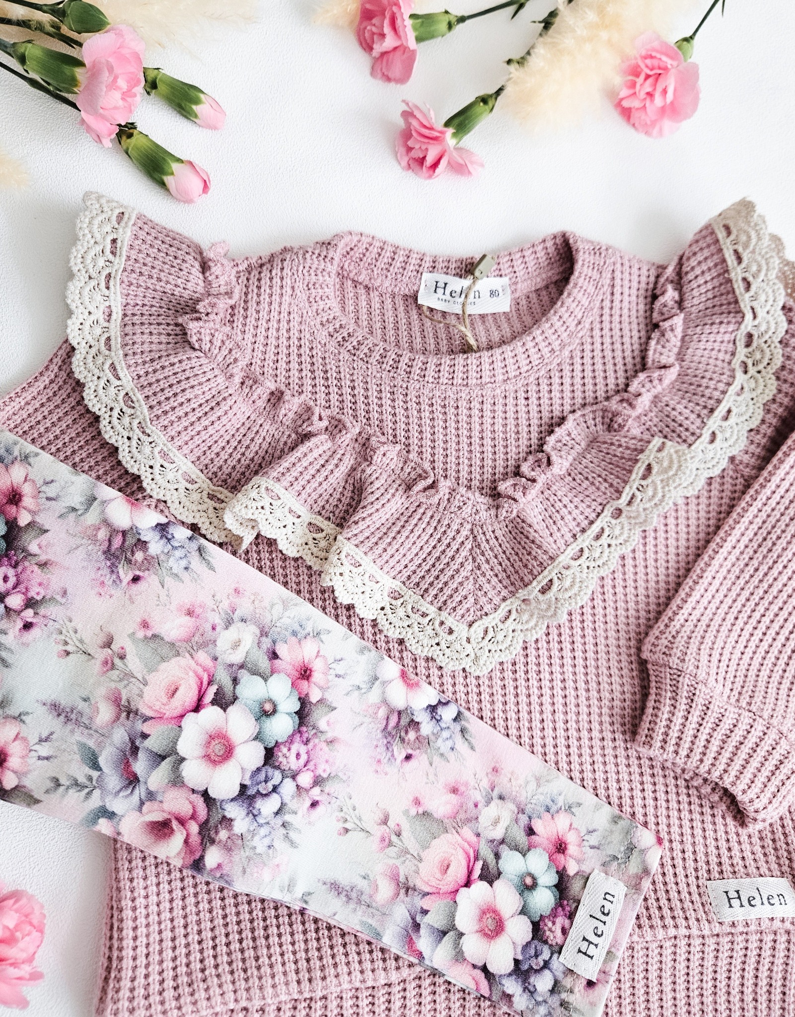 Kaunis ja pehme tüdrukute kampsun õrnas puudriroosas toonis. Kampsunit kaunistavad romantilised satsid ja pitsid, mis annavad sellele armsa ja tüdrukuliku ilme. Sooniline struktuur lisab tekstuuri ning pehme materjal tagab lapsele sooja ja mugava tunde igal aastaajal.