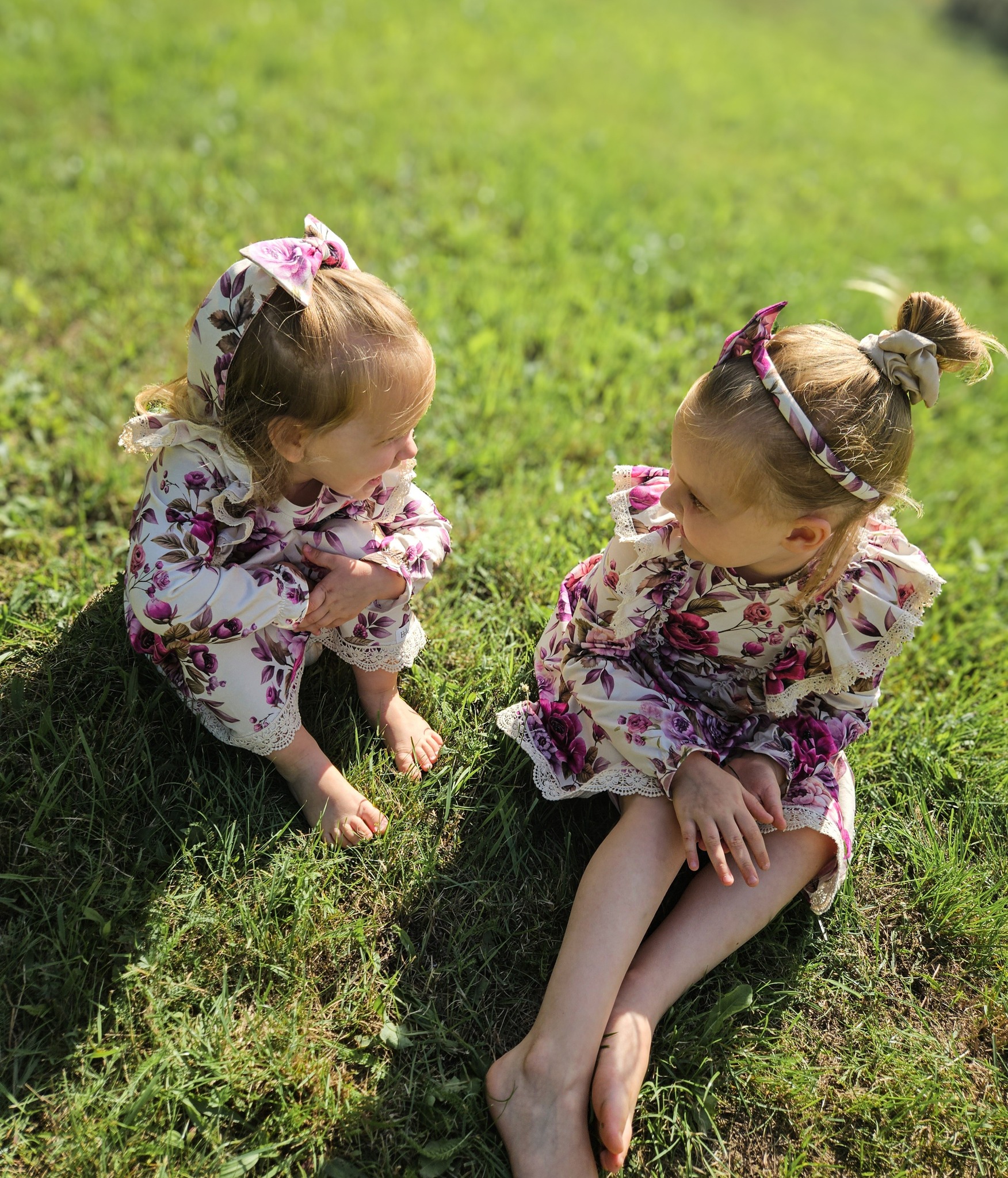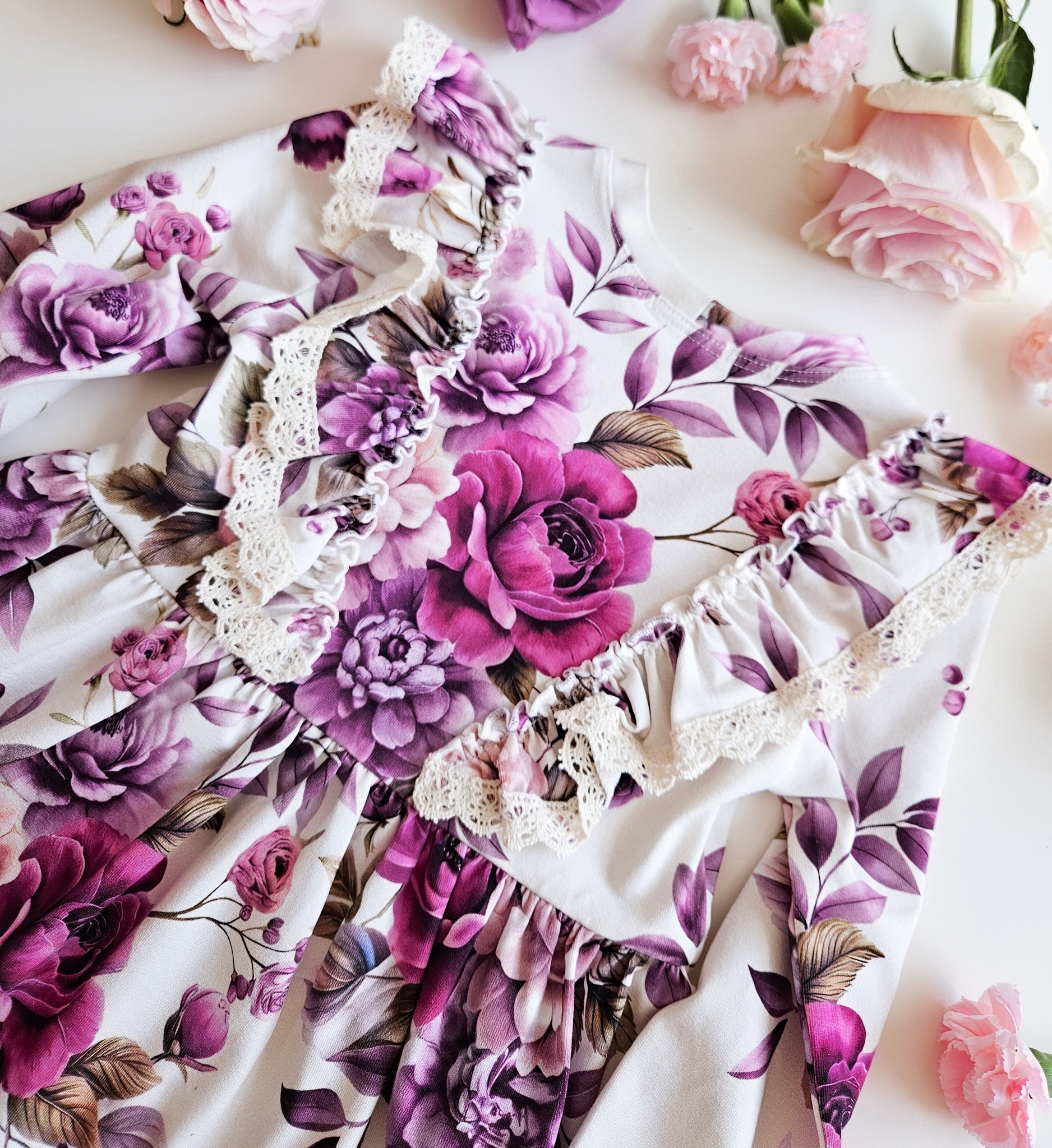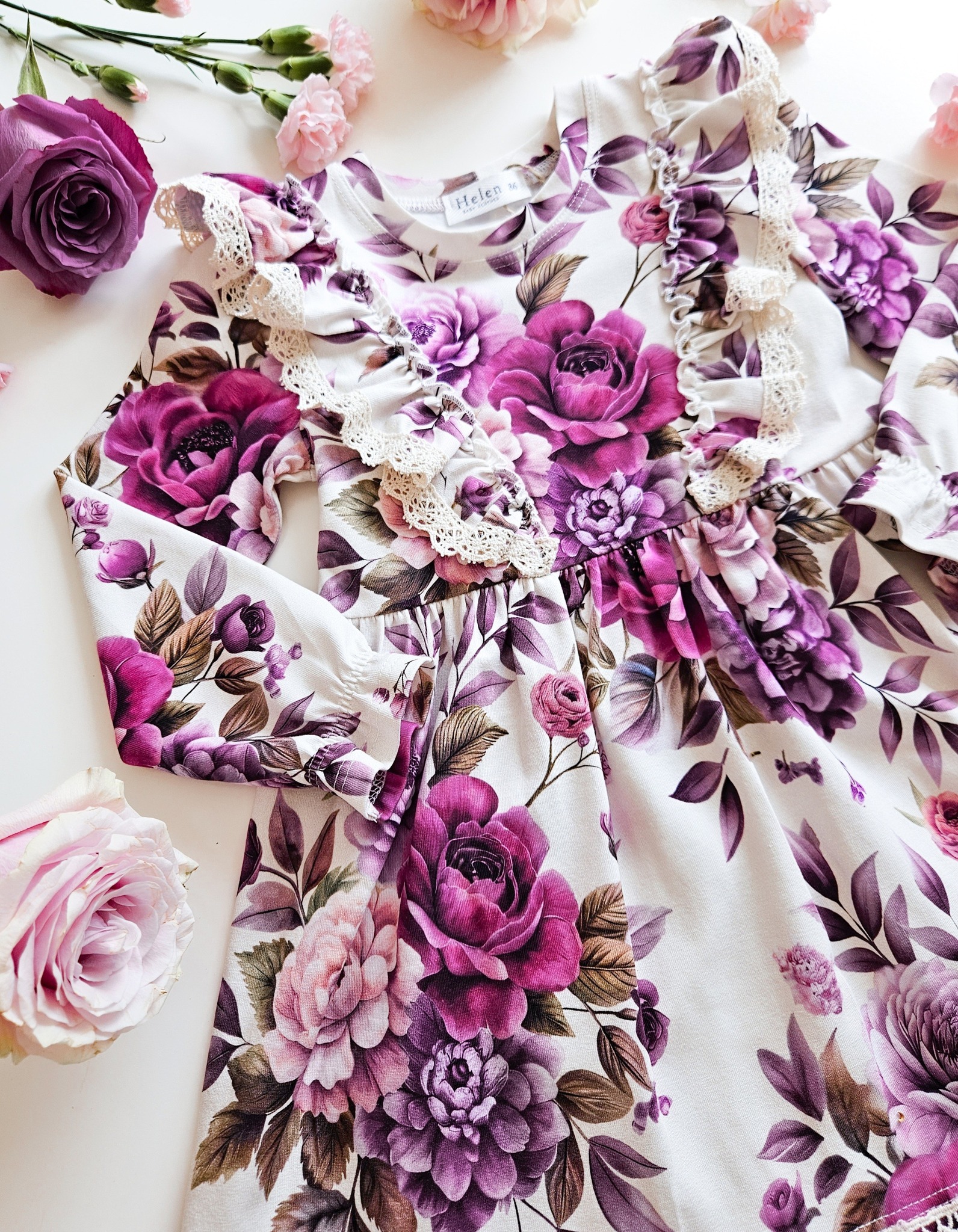Imeliselt romantiline lillekleit, mis viib otse õitsvasse roosiaeda. Sügavlillad ja roosad õied kaunistavad kleiti elegantselt, pitsi- ja volangidetailid lisavad aga pehmust ja tüdrukulikku võlu. Täiuslik valik nii pidulikeks sündmusteks kui ka erilisemateks igapäevahetkedeks.