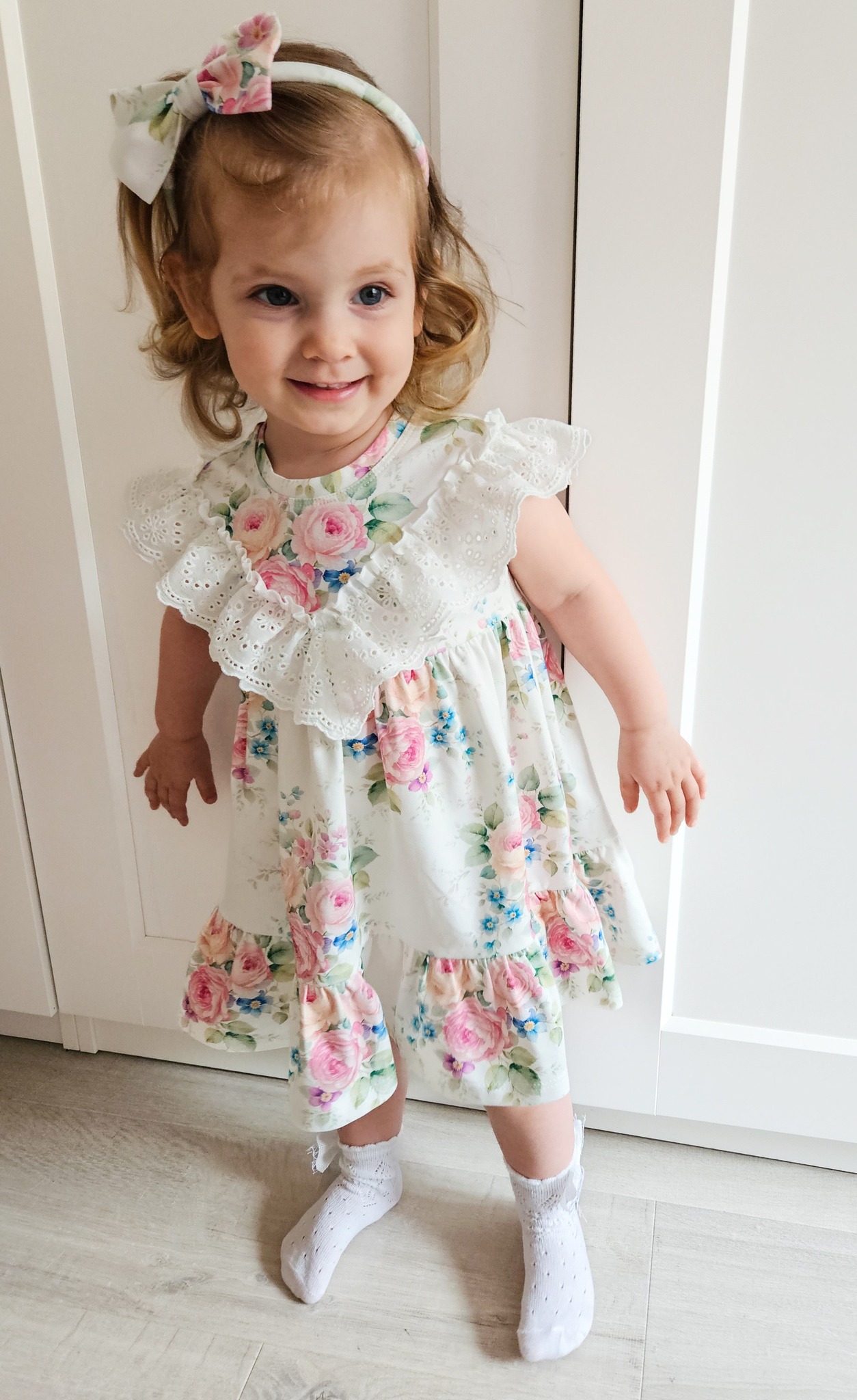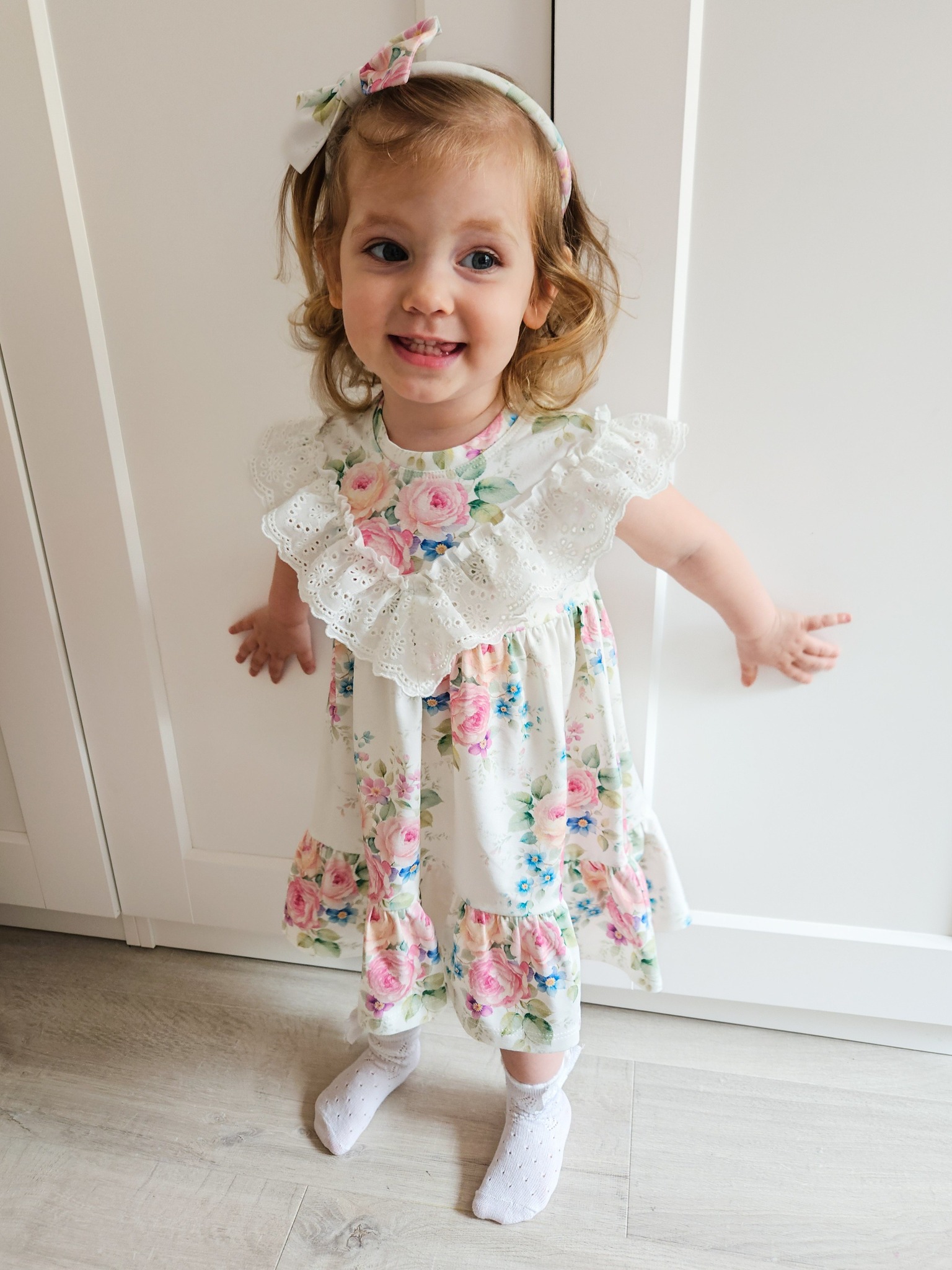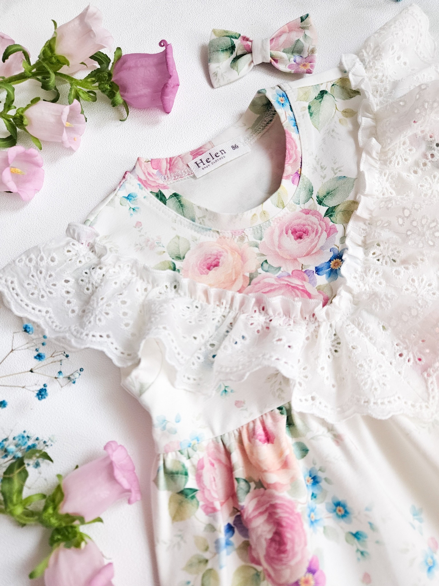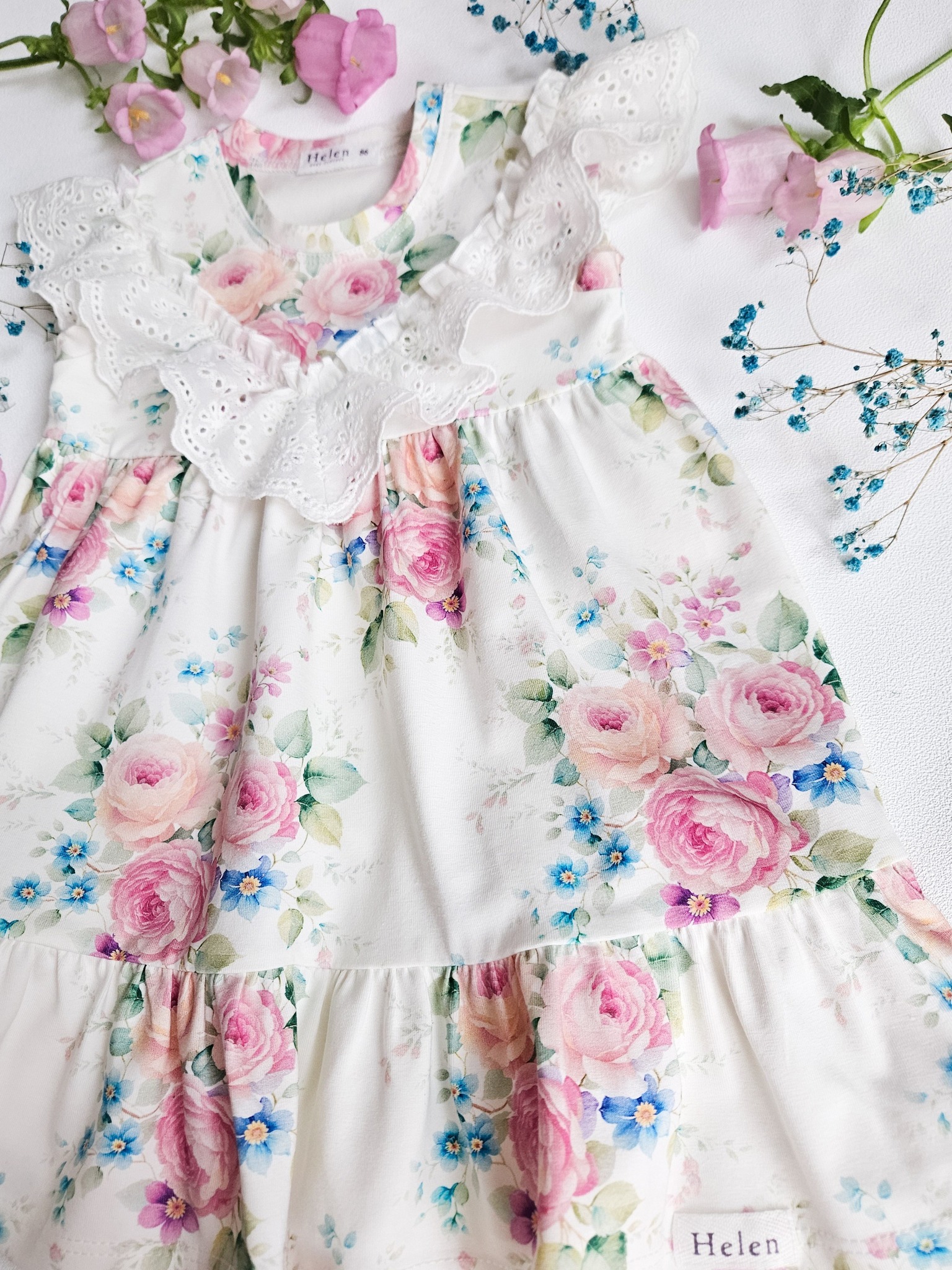 Õrn ja romantiline lillekleit, mis toob esile tõelise printsessiliku ilu. Helgetes toonides roosimuster koos väikeste siniste õitega loob värske ja piduliku meeleolu. Kaunistuseks lisatud pitsist volang kaelaosale lisab kleidile luksuslikku ja ajatut võlu. Täiuslik valik sünnipäevadeks, pidulikeks koosviibimisteks või lihtsalt eriliseks päevaks.