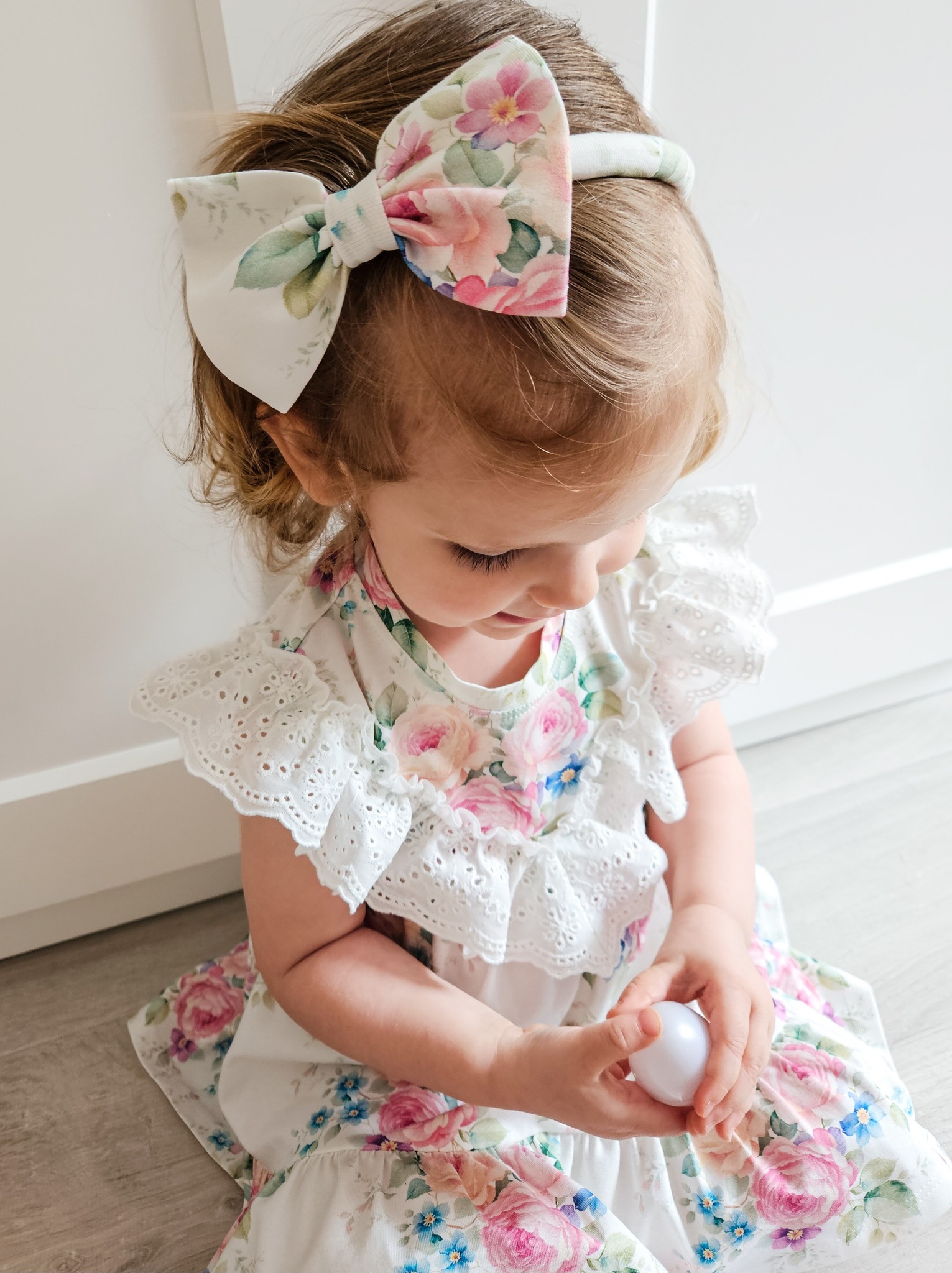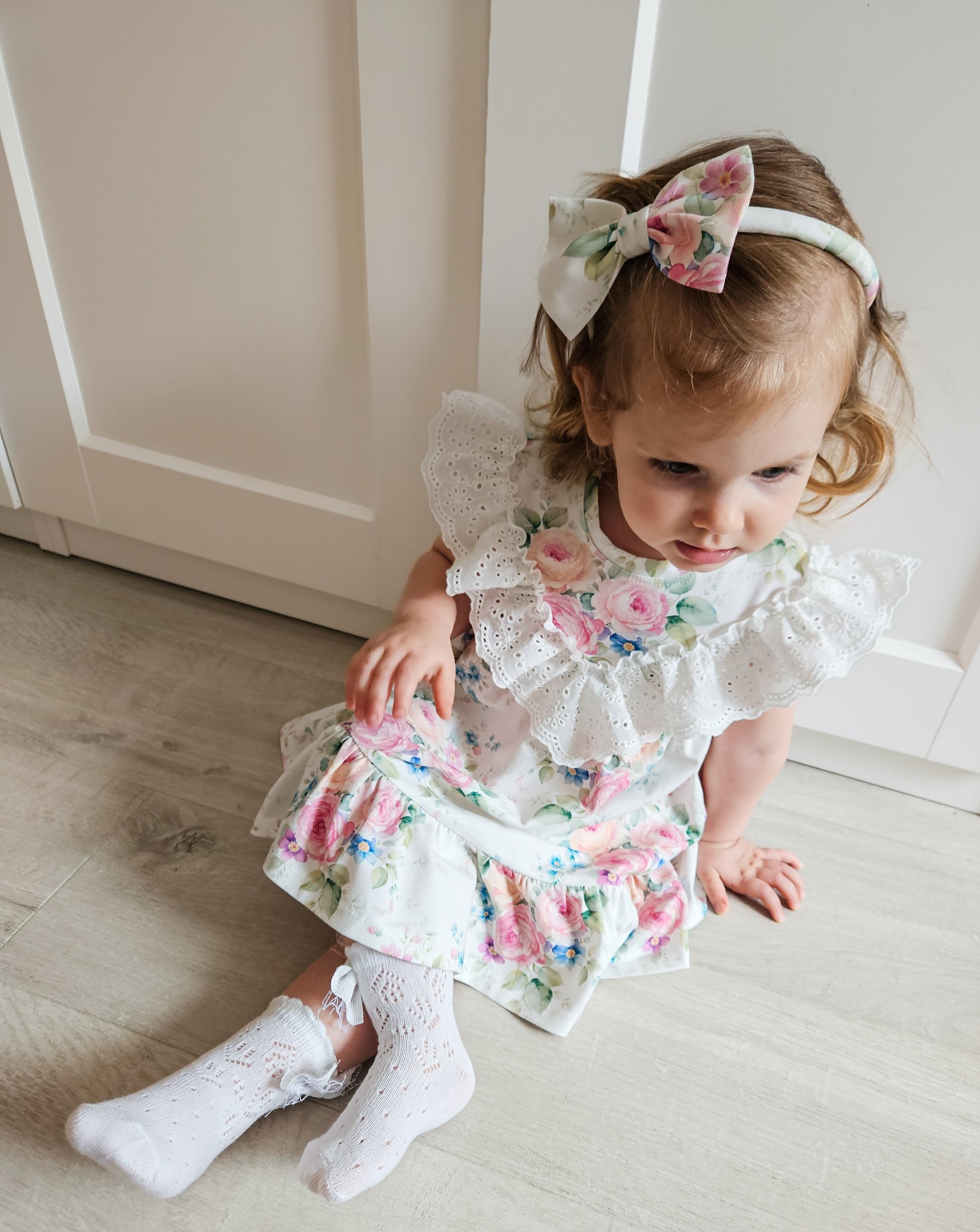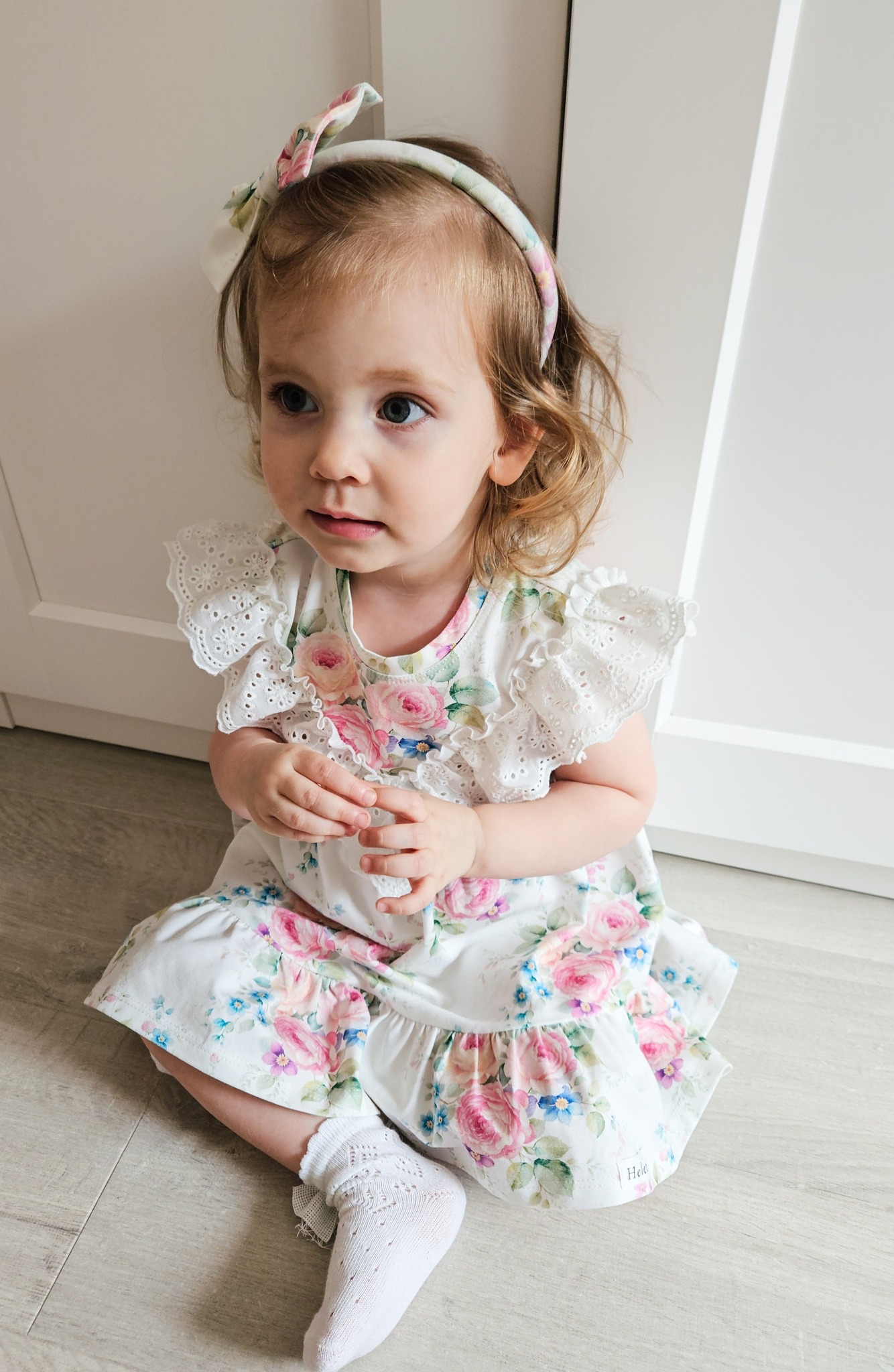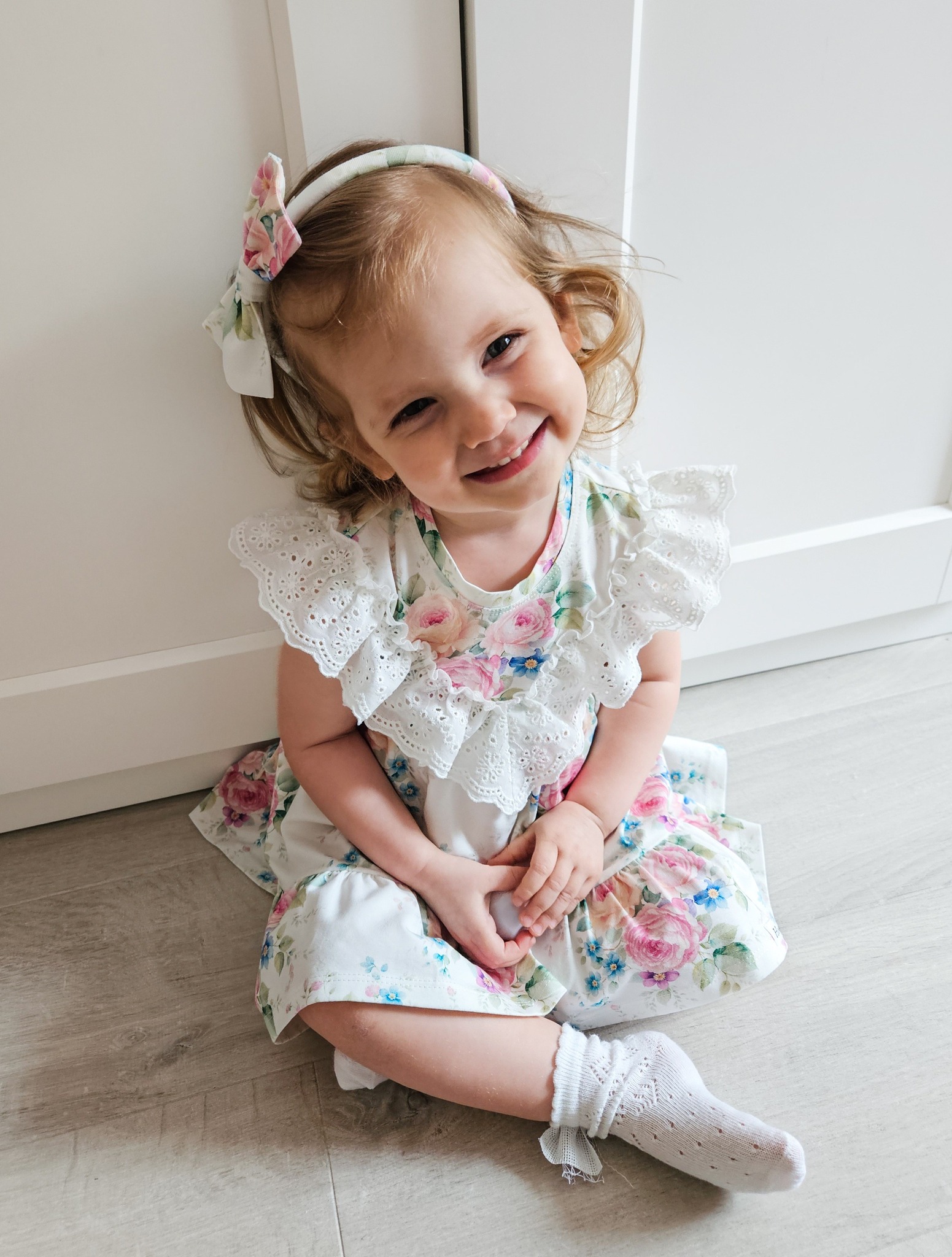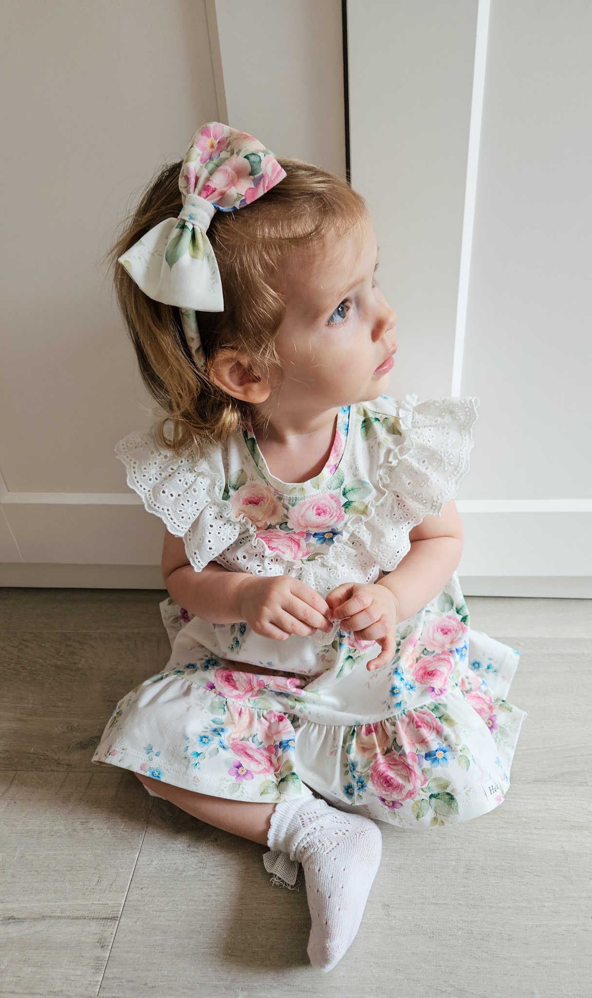 Õrn ja romantiline lillekleit, mis toob esile tõelise printsessiliku ilu. Helgetes toonides roosimuster koos väikeste siniste õitega loob värske ja piduliku meeleolu. Kaunistuseks lisatud pitsist volang kaelaosale lisab kleidile luksuslikku ja ajatut võlu. Täiuslik valik sünnipäevadeks, pidulikeks koosviibimisteks või lihtsalt eriliseks päevaks.