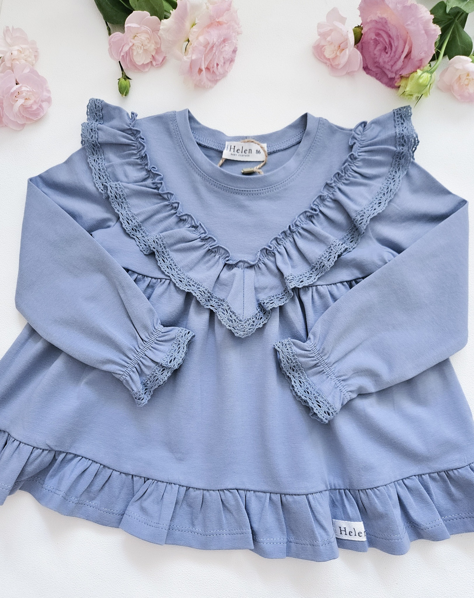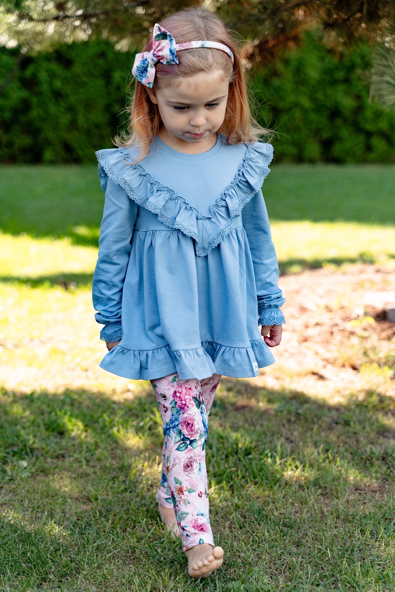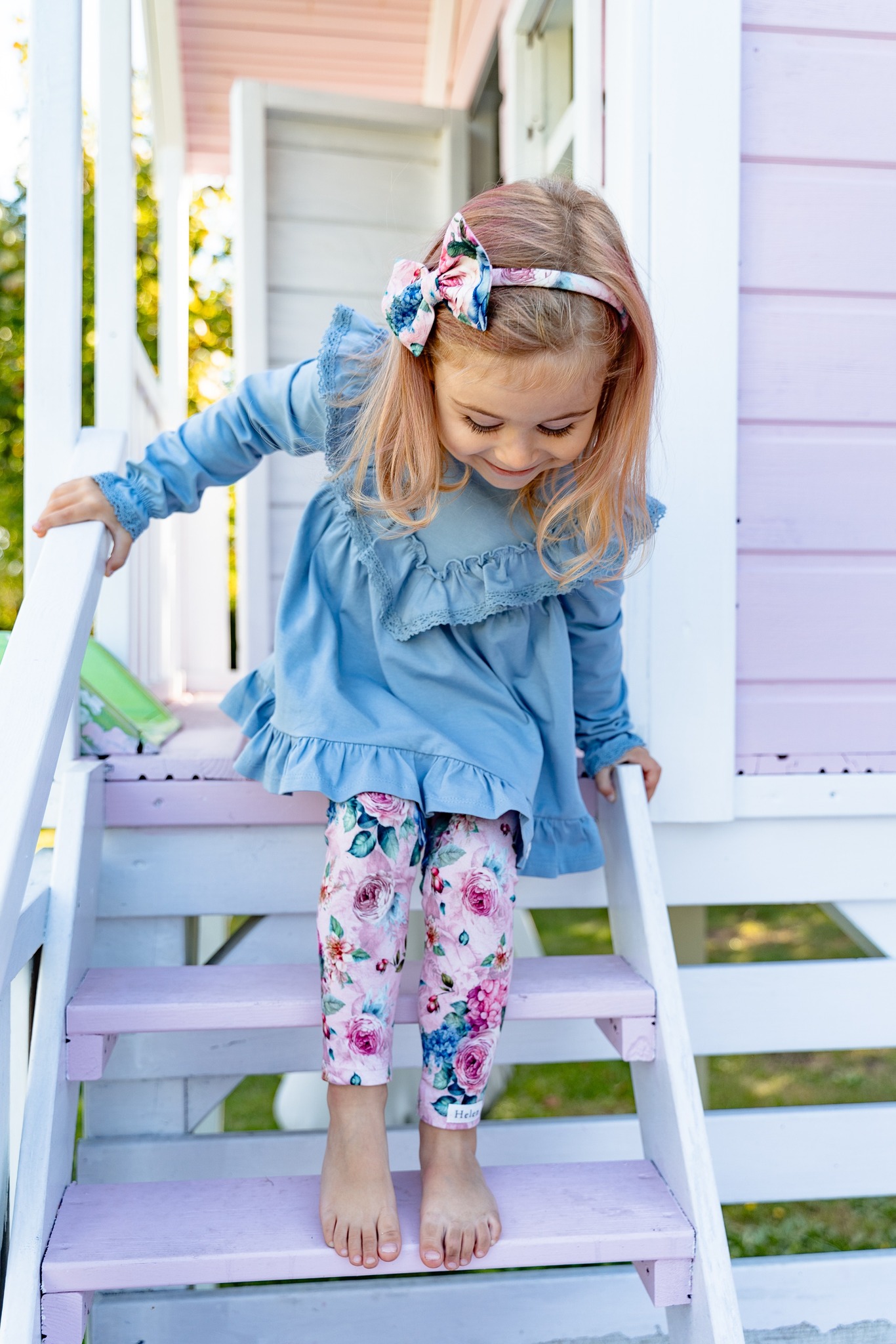 Helesinine tuunika ja sama tooni leggingsite komplekt satside ja pitsdetailidega. Pehme ja veniv kangas (90% puuvill, 10% elastaan) tagab mugavuse kogu päevaks.