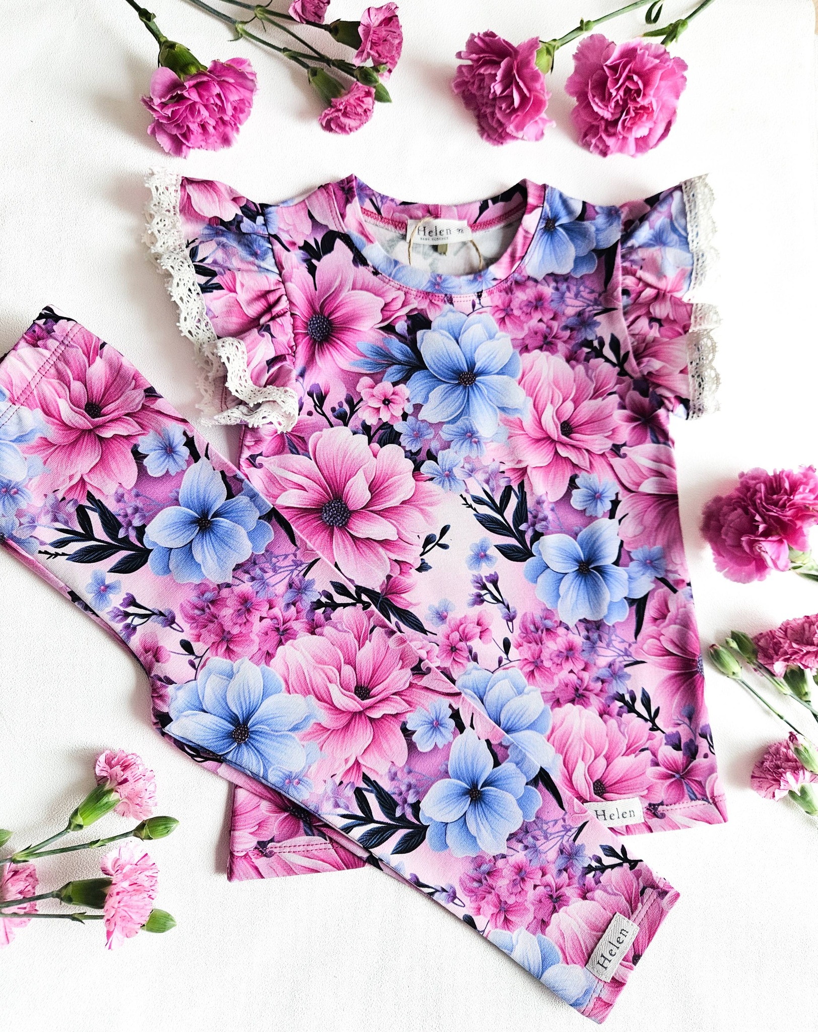 🔍 Märksõnad: tüdrukute lilleline komplekt, body ja retuusid, pluus ja retuusid, sinise ja roosaga komplekt, romantiline laste riietus, mugav laste komplekt