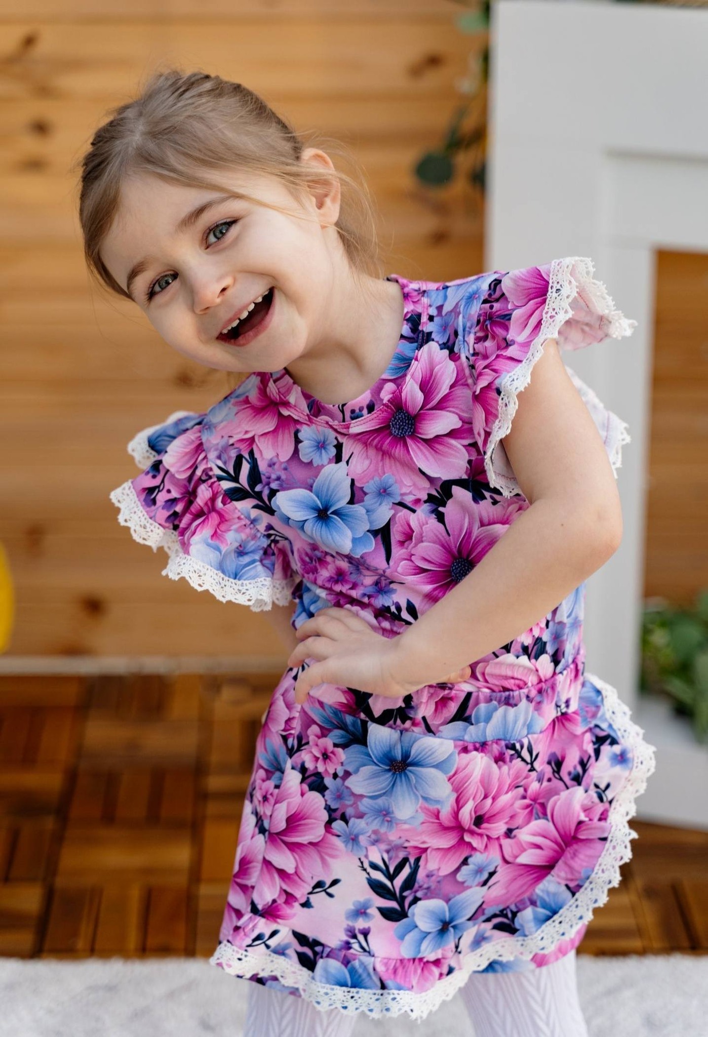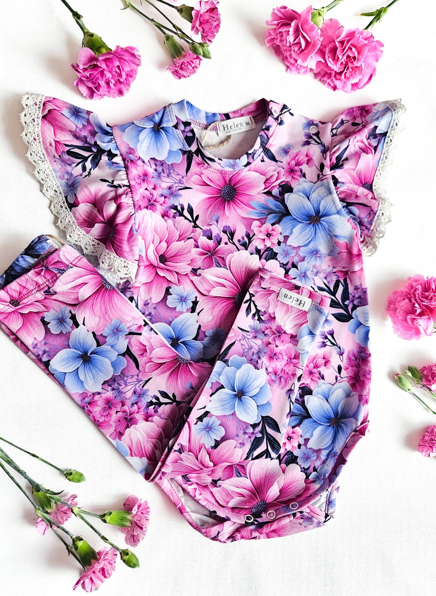 Õrn ja pilkupüüdev lillemustriga komplekt, mis ühendab romantilise välimuse ja igapäevase mugavuse. Kaunid roosad ja sinised õied loovad värske ja rõõmsa koosluse, mis sobib nii mängimiseks kui ka pidulikemateks hetkedeks.