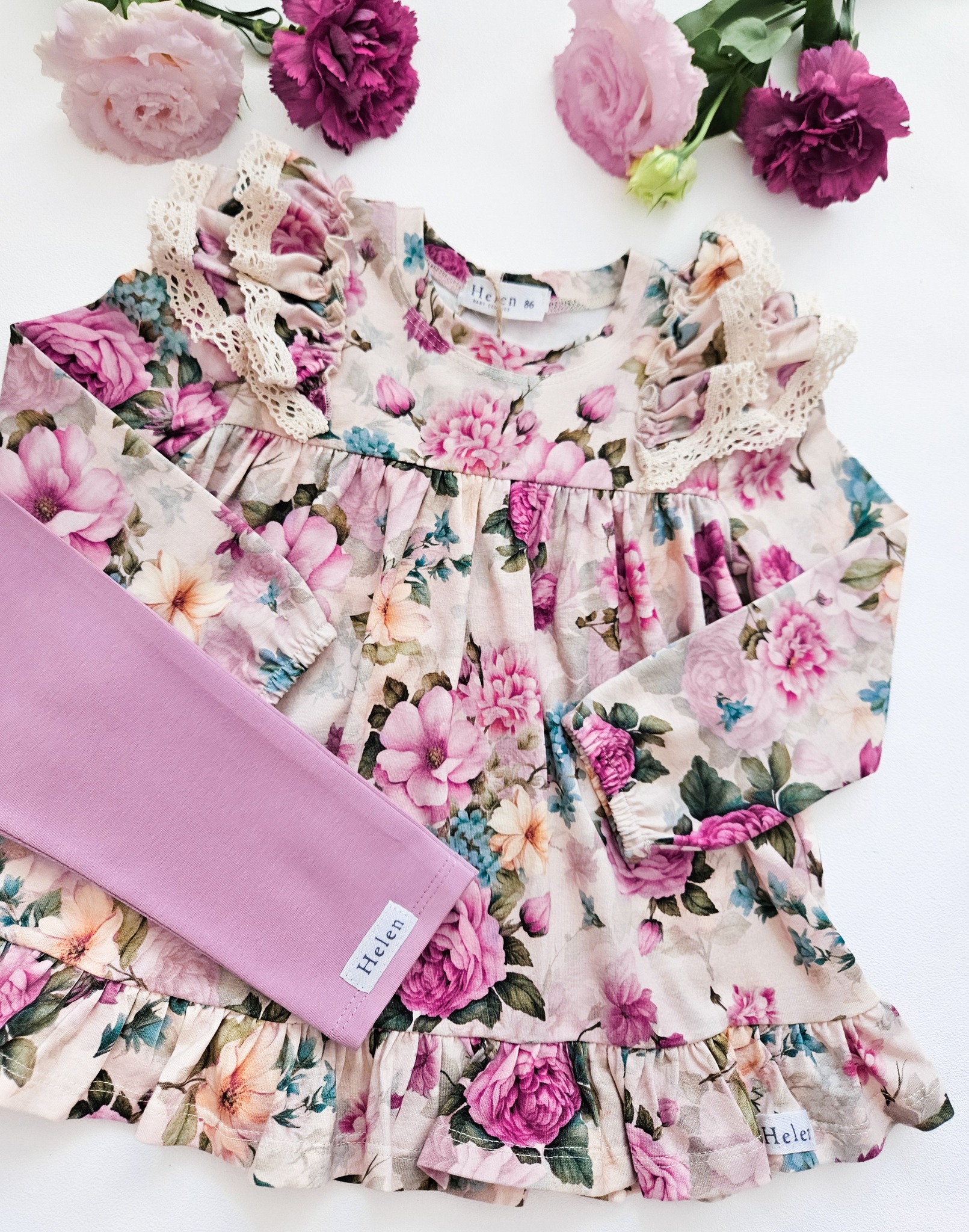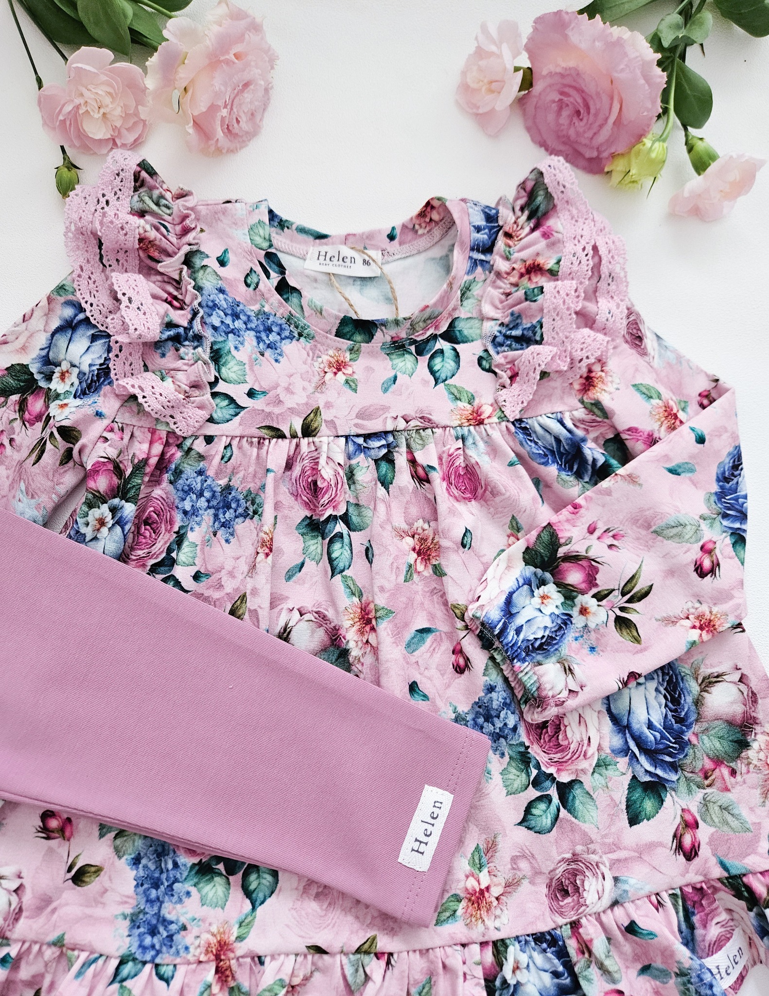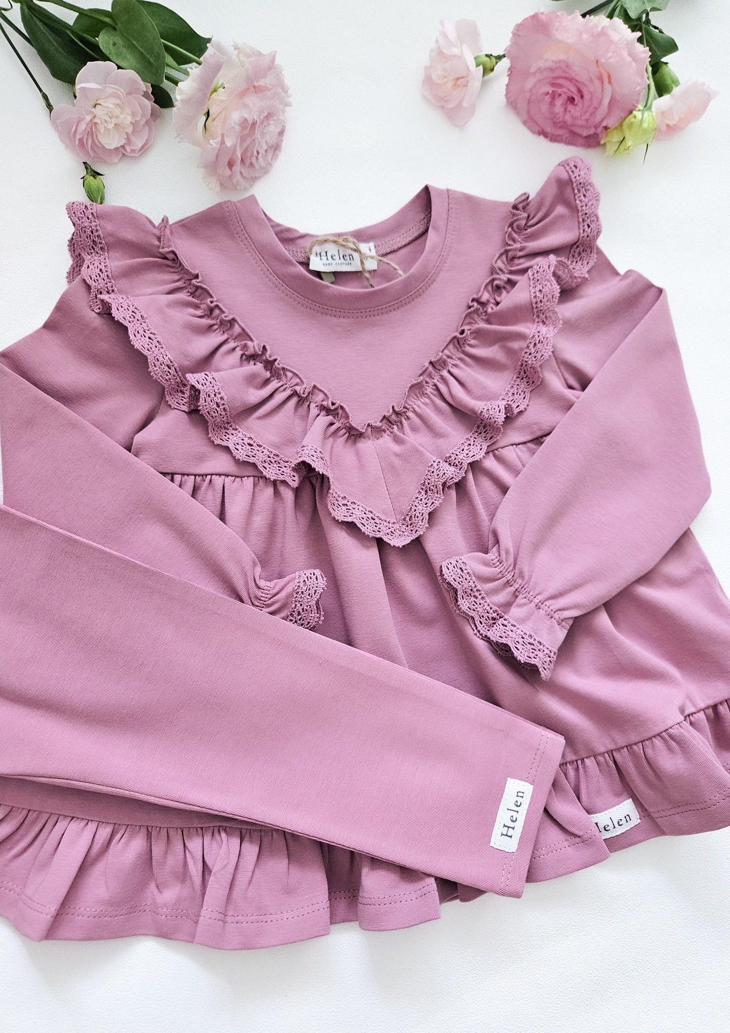 Vanaroosa tuunika ja sama tooni leggingsite komplekt satside ja pitsdetailidega. Pehme ja veniv kangas (90% puuvill, 10% elastaan) tagab mugavuse kogu päevaks.