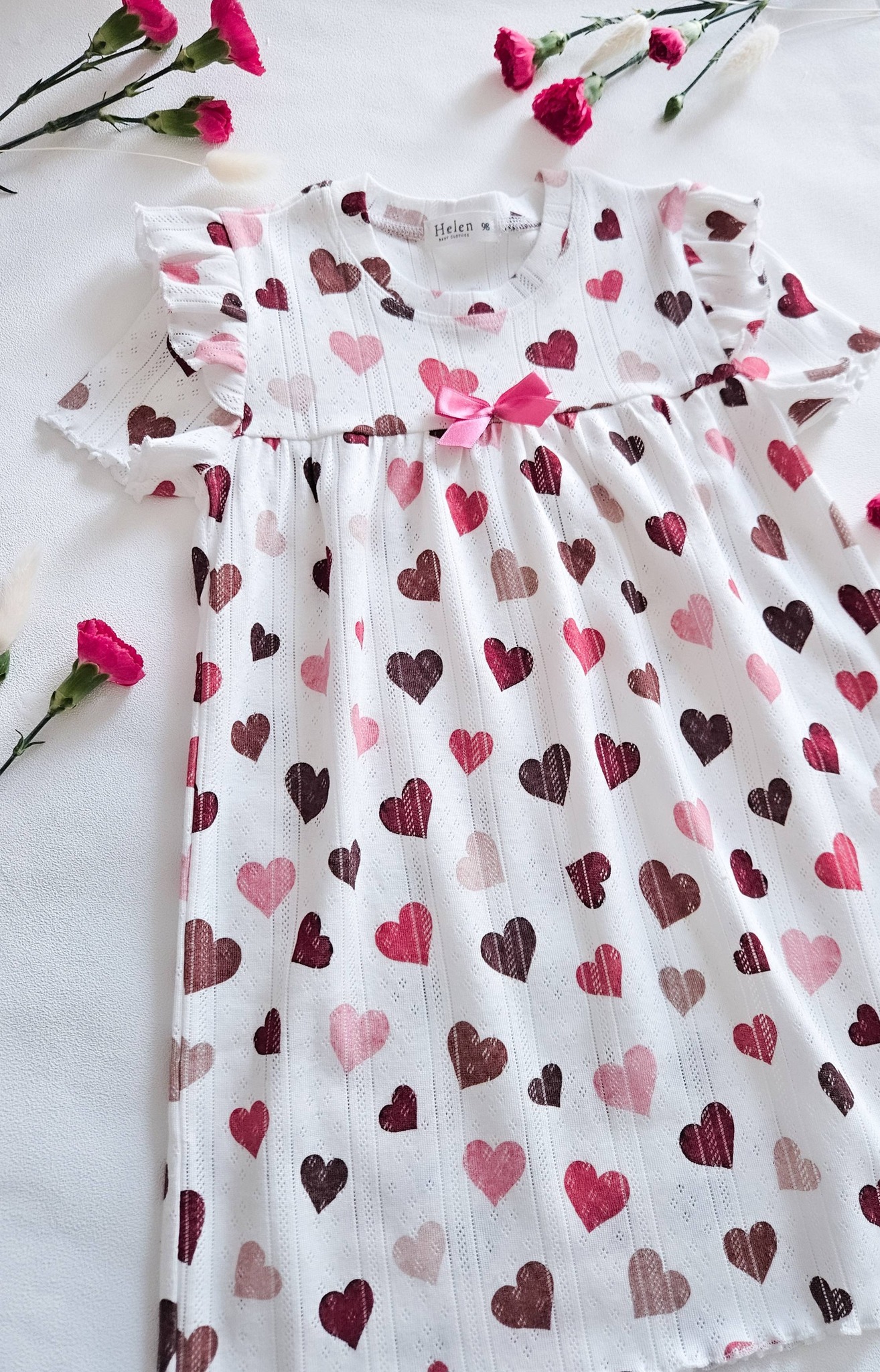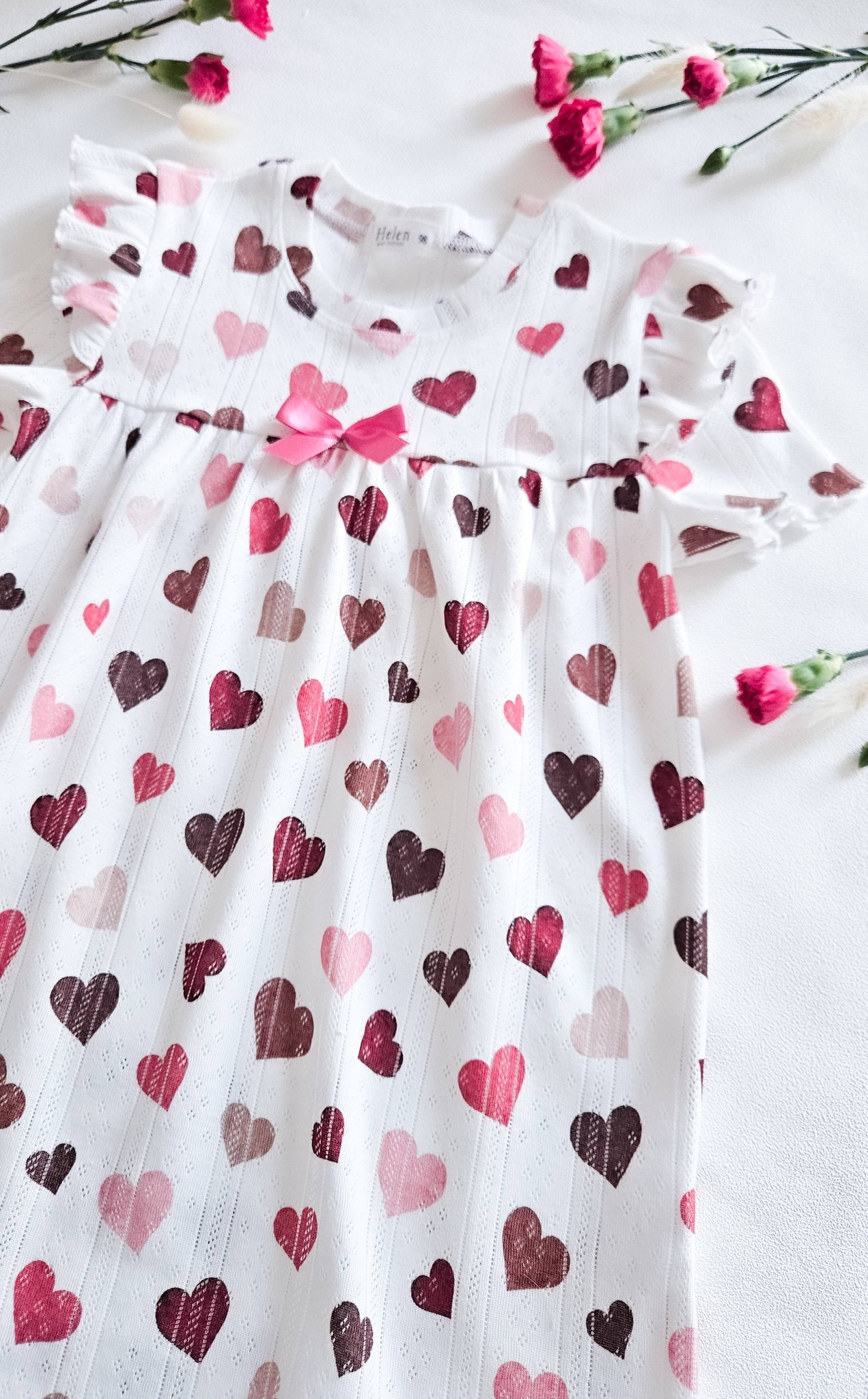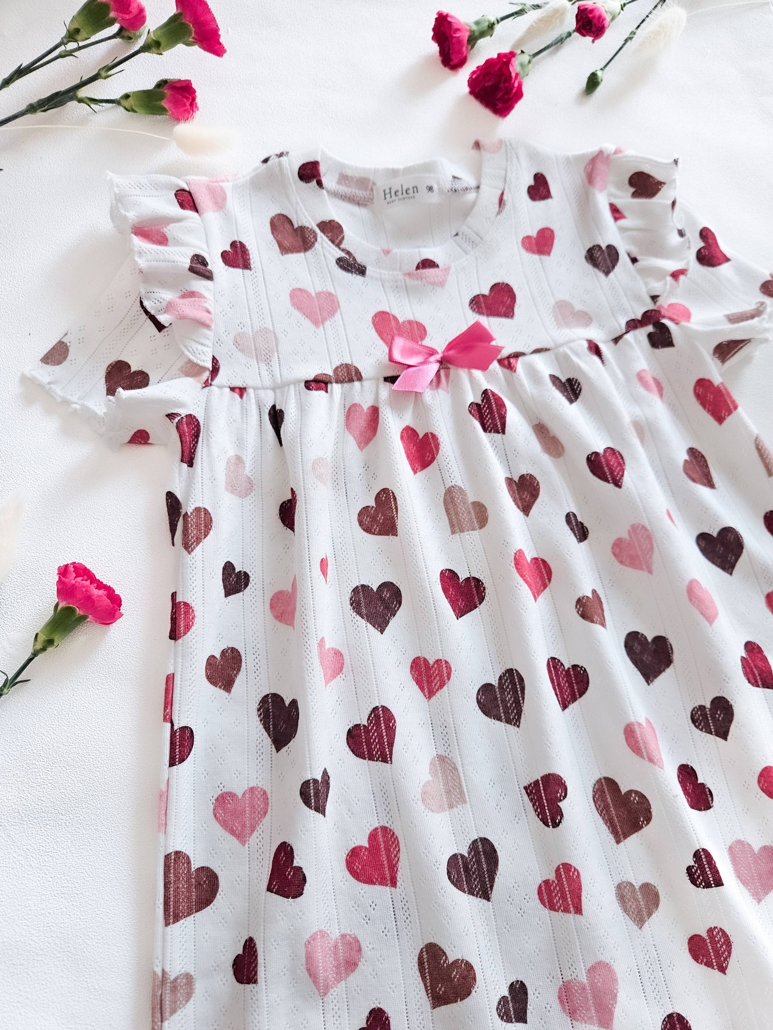 Õrn ja romantiline laste öösärk, mida kaunistavad erinevates roosades ja pruunikates toonides südamed heledal taustal. Südame­muster loob sooja ja turvalise meeleolu ning muudab öösärgi lapse lemmikuks igal õhtul.