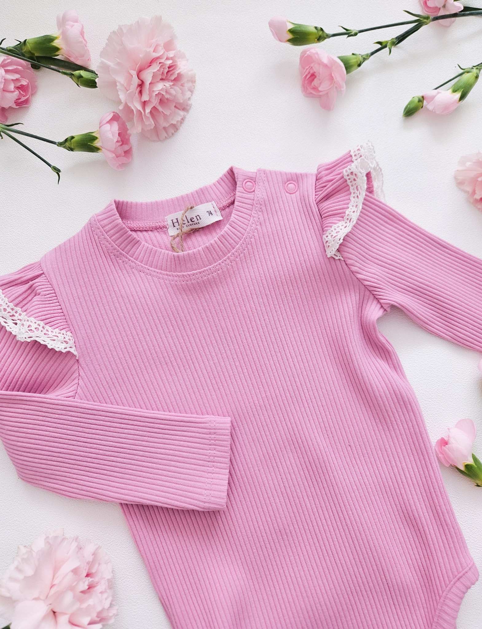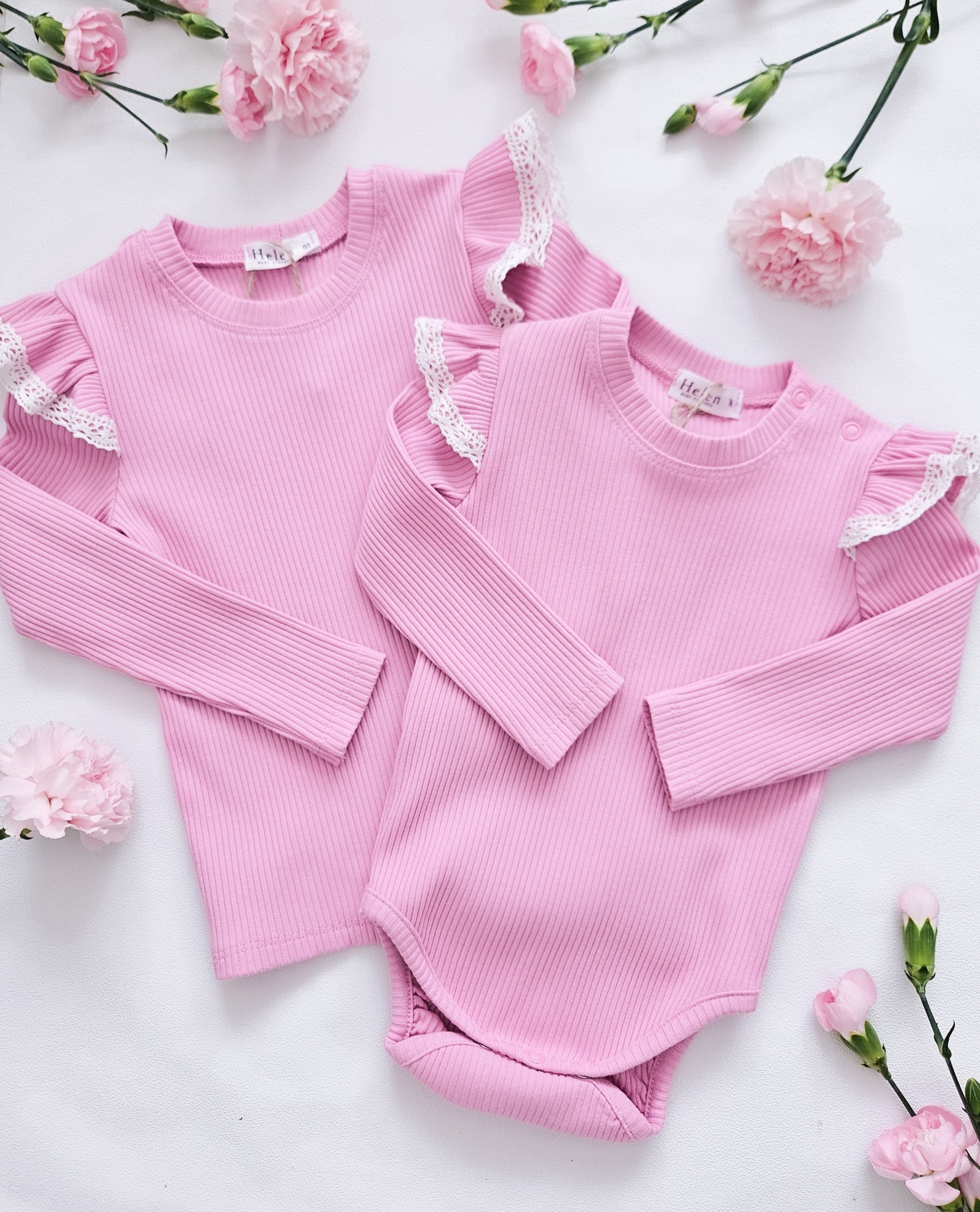 Armas ja mänguline tüdrukute pluus, mis on valmistatud kvaliteetsest soonikkangast. Kommiroosa toon lisab rõõmu ja värskust, samas kui õlgu kaunistavad pitsilised satsid annavad romantilise ja õrna ilme. See pluus on ideaalne valik nii igapäevaseks kandmiseks kui ka pidulikumateks sündmusteks.