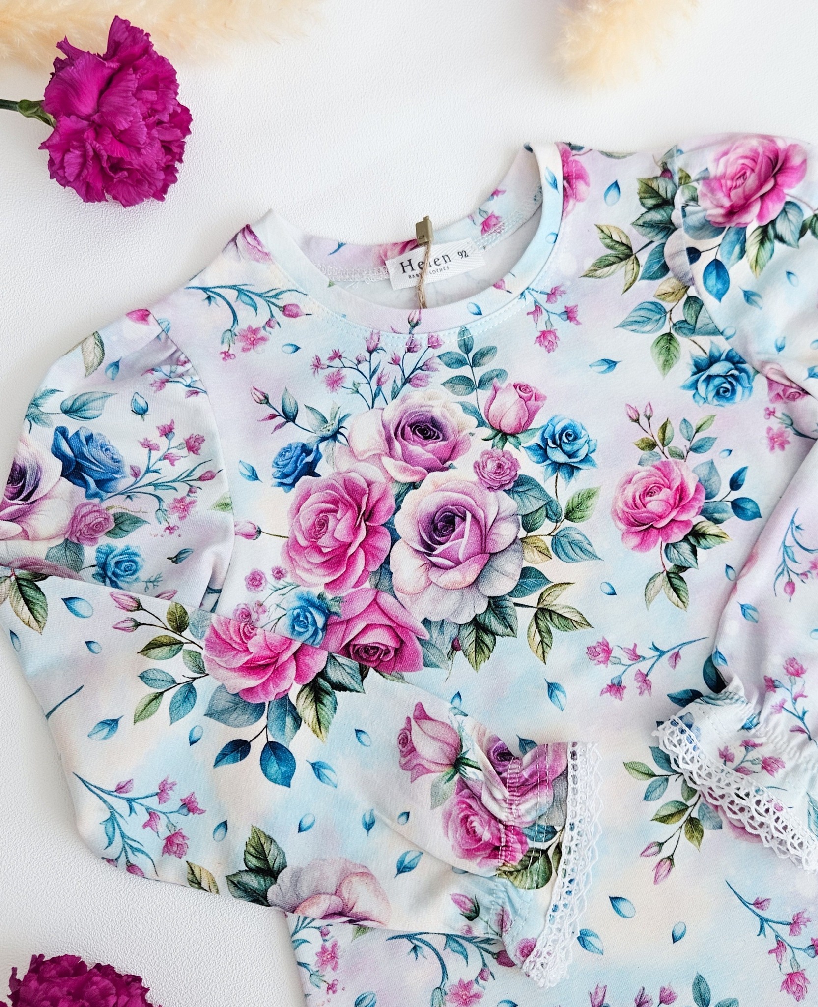 Romantiline ja mugav pluus, mille kaunistuseks on roosad ja sinised roosid ning pitsilised detailid varrukatel.