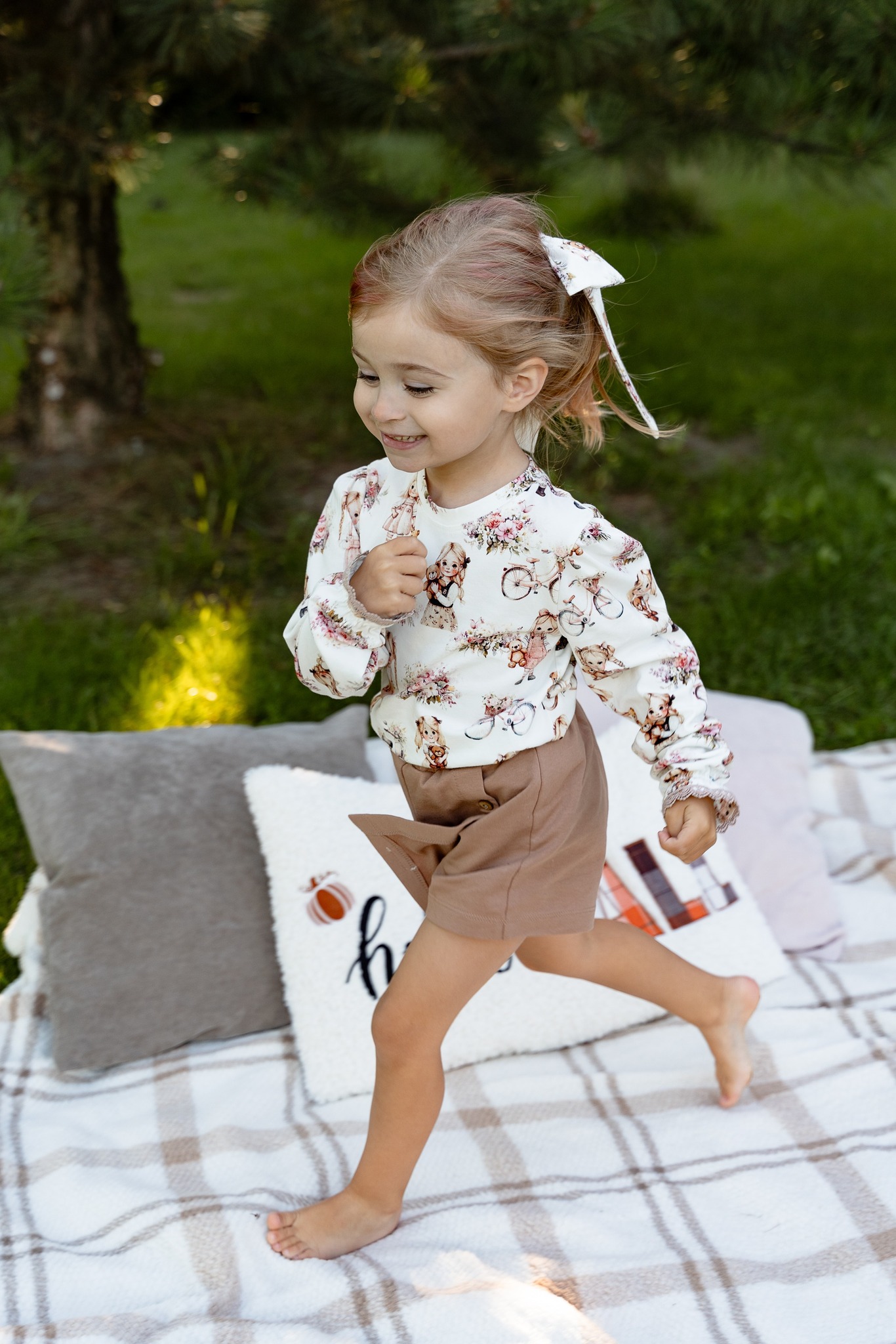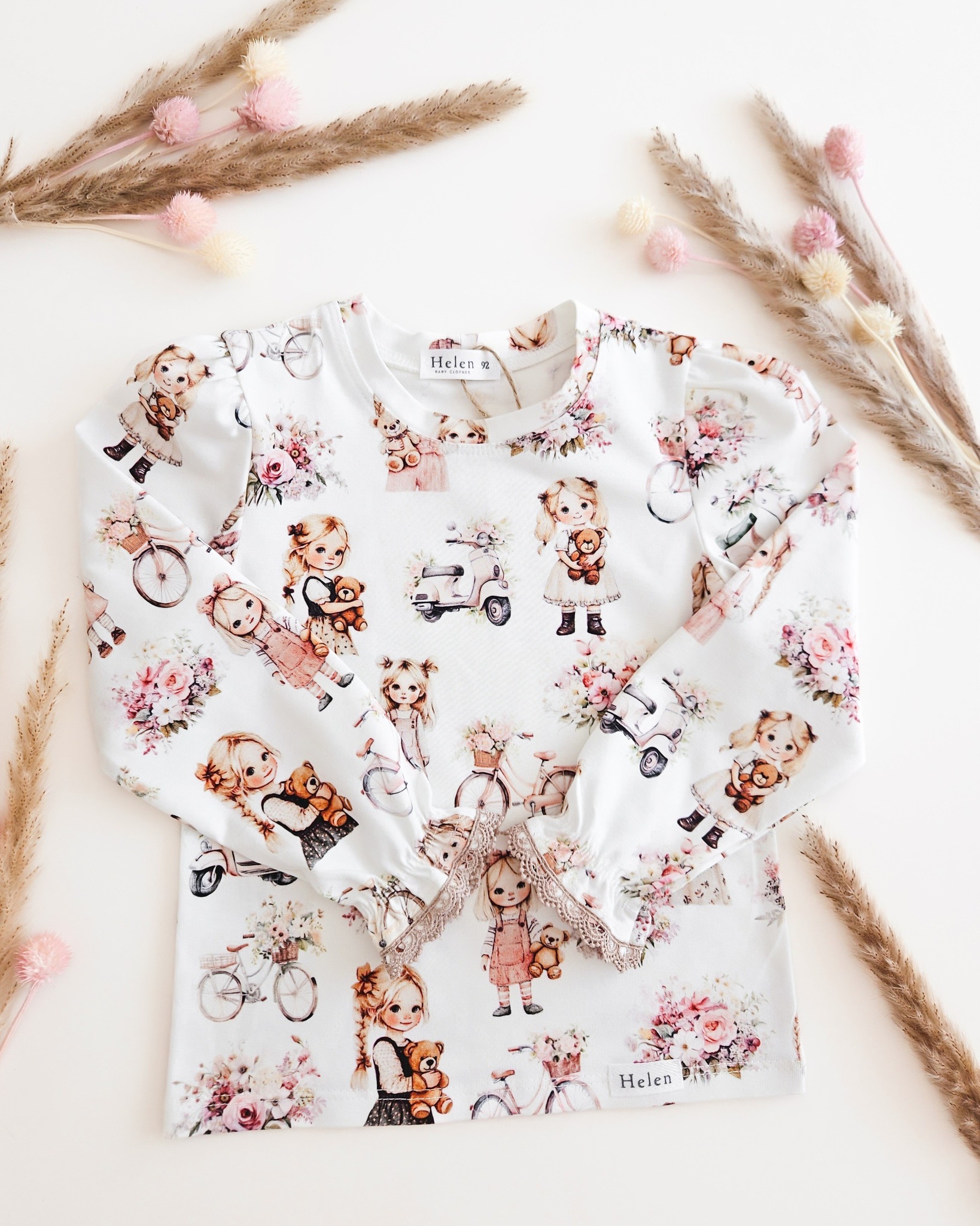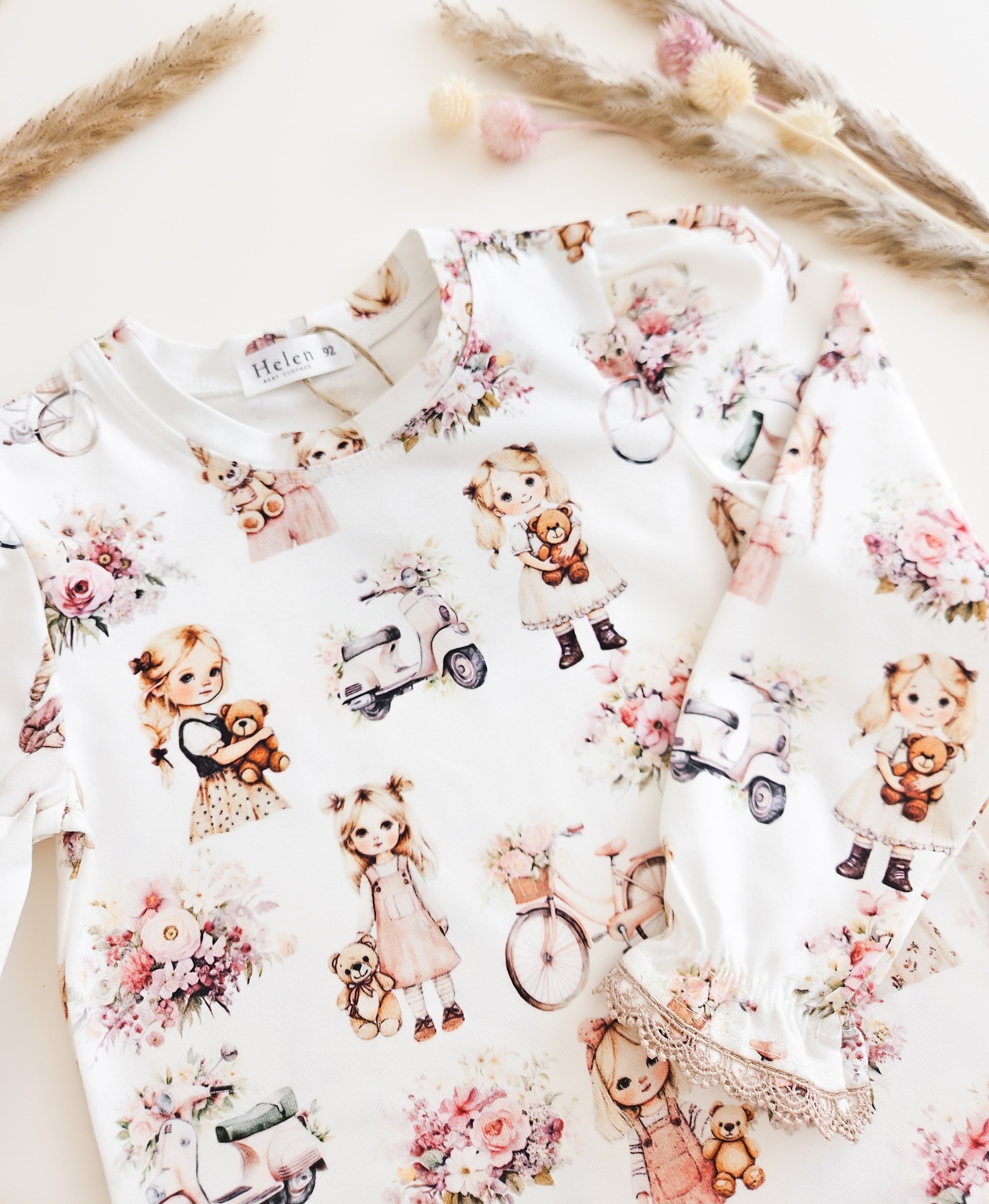 Romantilise lillemustriga pikkade varrukatega pluus tüdrukule. Pehme ja veniv puuvillane kangas (90% puuvill, 10% elastaan) tagab mugavuse kogu päevaks. Saadaval suurustes 92–134.