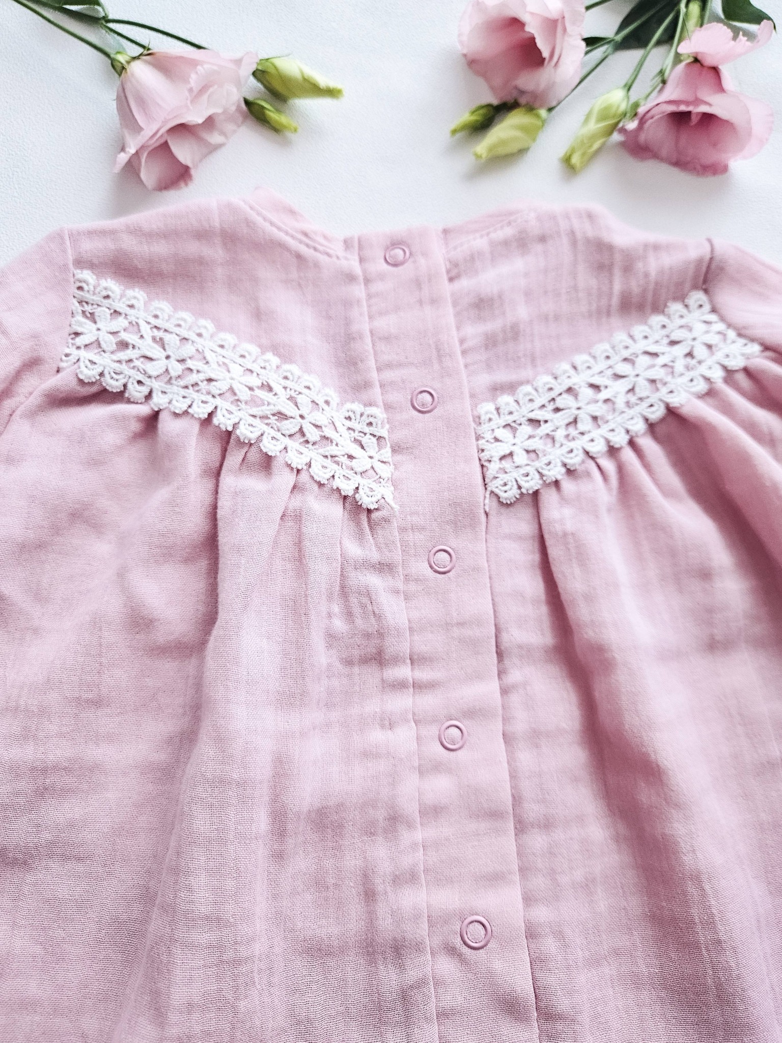 Pehmest musliinkangast roosa tuunika pitsdetailidega – õhuline, mugav ja ideaalne igapäevaseks kandmiseks.